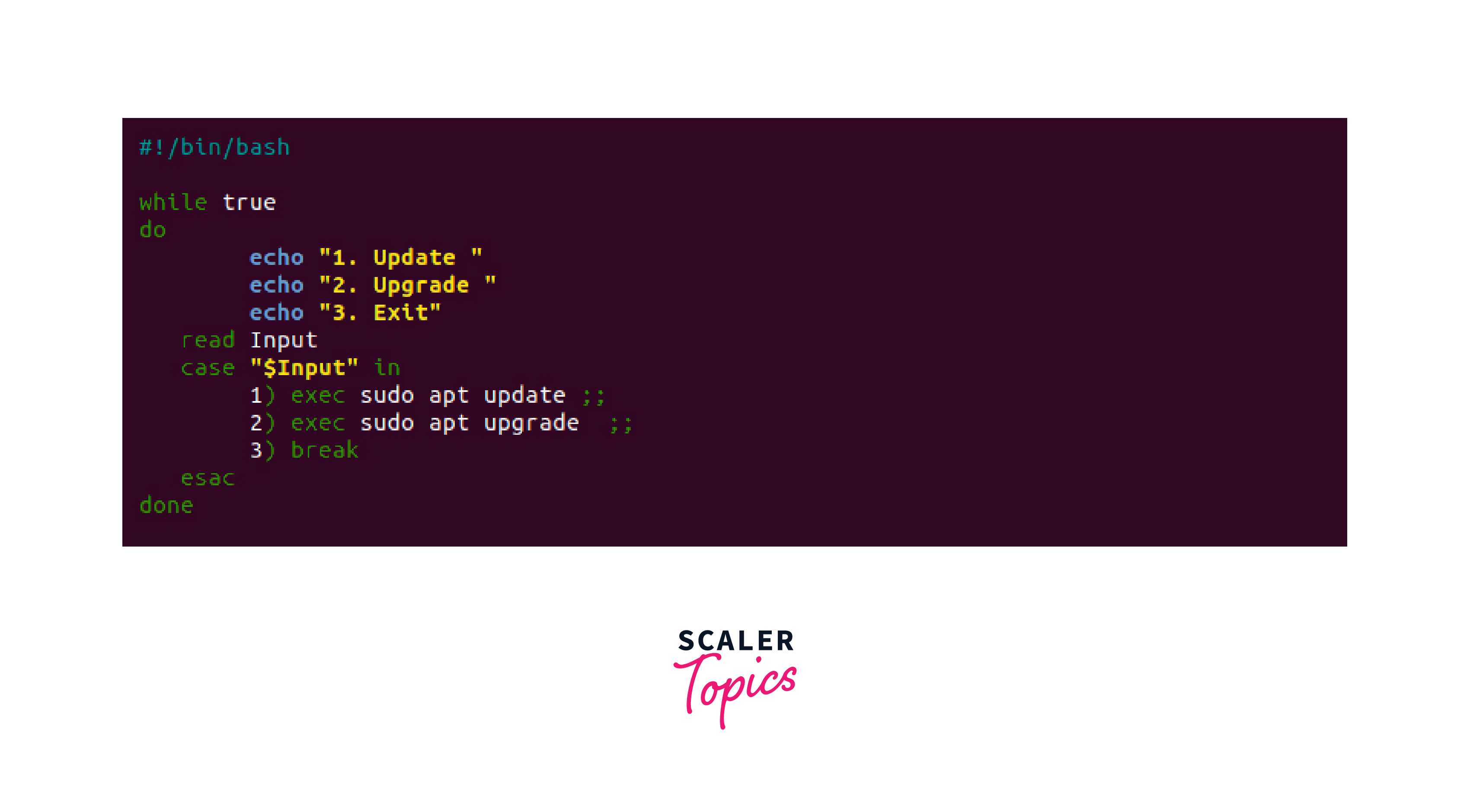 - 10th-11th line: The apt upgrade command replaces the current shell. The terminal session stops after the update or upgrade process is finished.