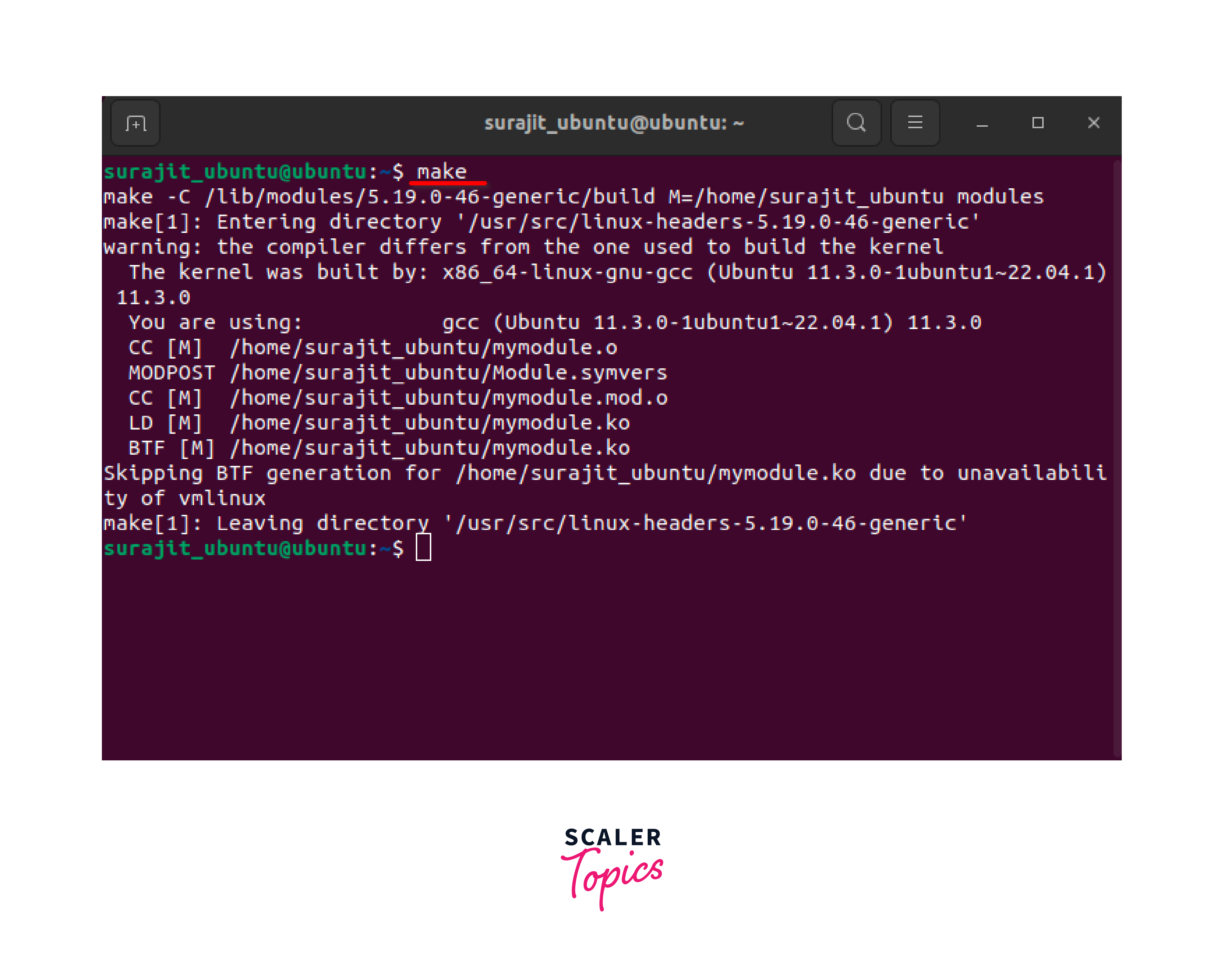 After the compilation process completes successfully, you should see the module object file (e.g., mymodule.ko) in the current directory. This indicates that the module has been compiled successfully.