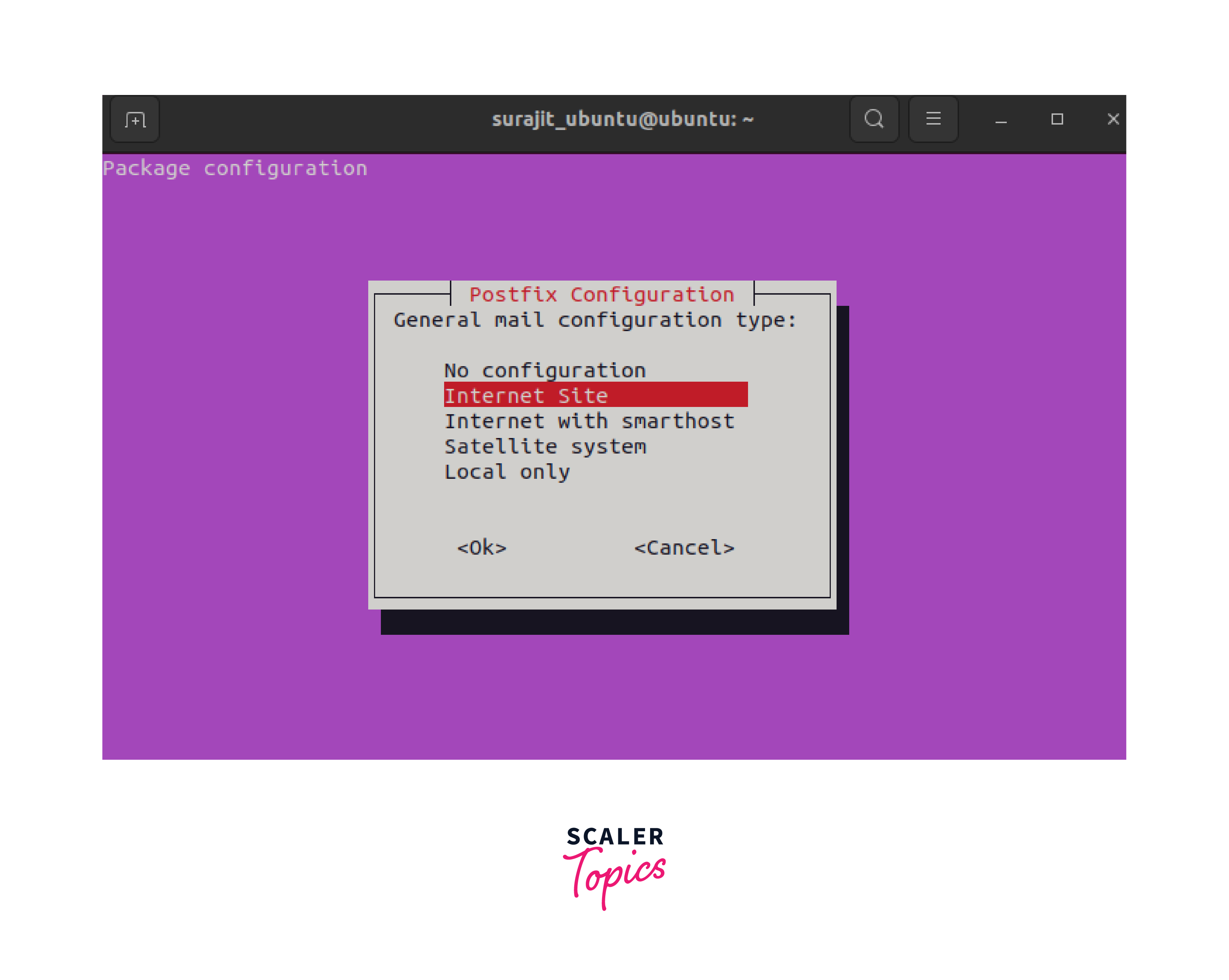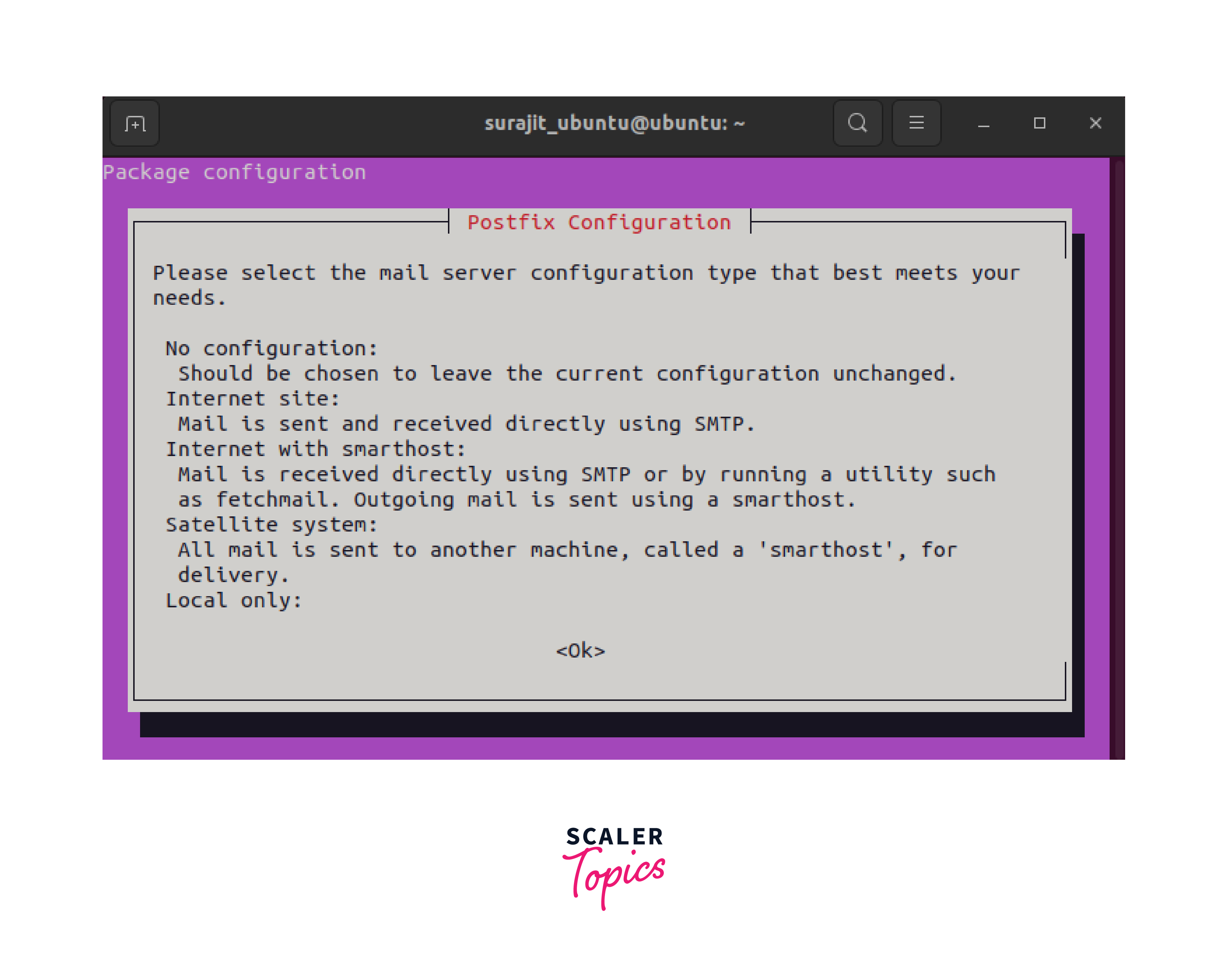 - Next, we need to choose the type of mail server for configuring it in Linux. We have chose the 'Local Configuration' for demonstration.