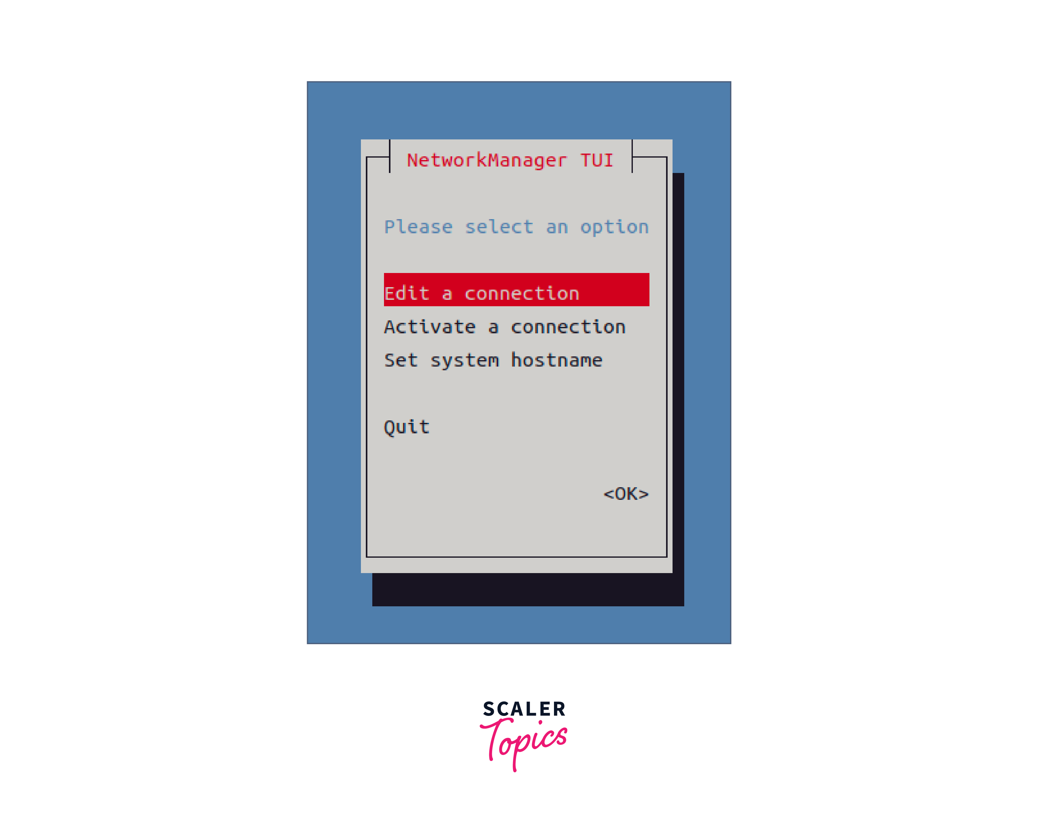 2. nmtui: nmtui (Network Manager Text User Interface) provides a text-based user interface for managing network connections. It offers a simple and easy-to-use interface to configure network settings. Users can navigate through the menus, select connections, and modify settings using keyboard inputs.