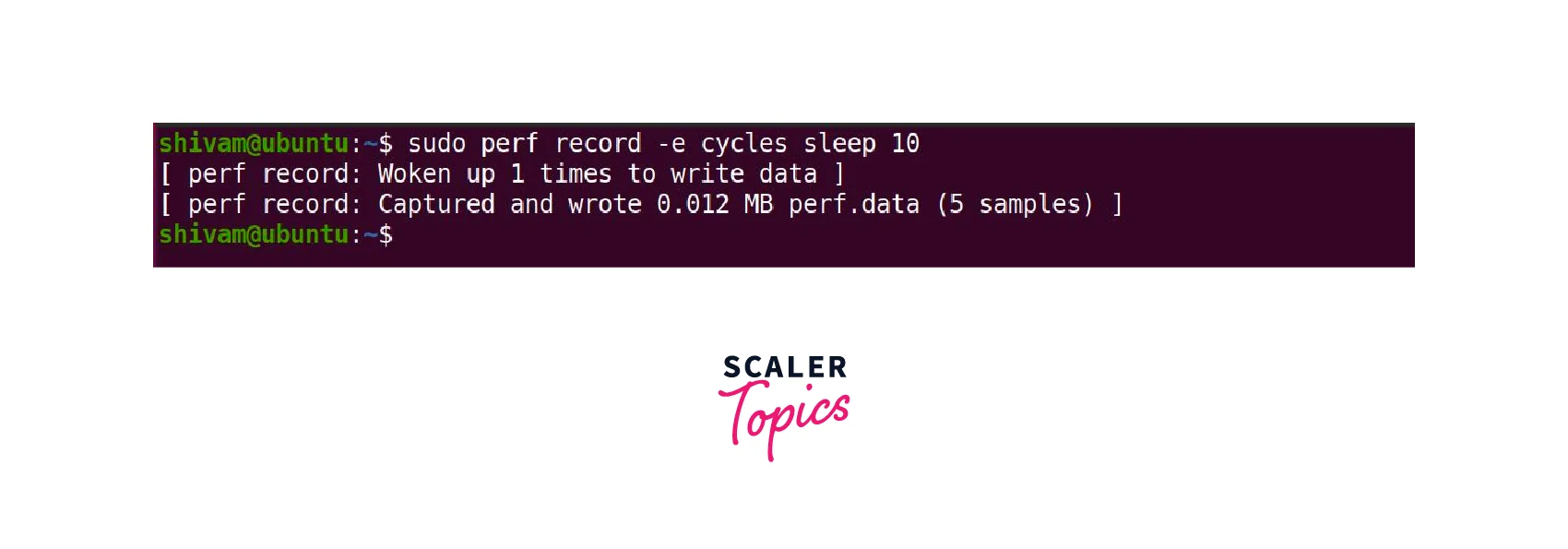 By executing the sudo perf record -e cycles sleep 10 command, you can record and collect CPU cycle information using perf for a specified duration of 10 seconds. The data acquired throughout the recording procedure is saved to a file named perf.data. The recording operation's output includes information on the size of the perf.data file and the number of data samples it contains.