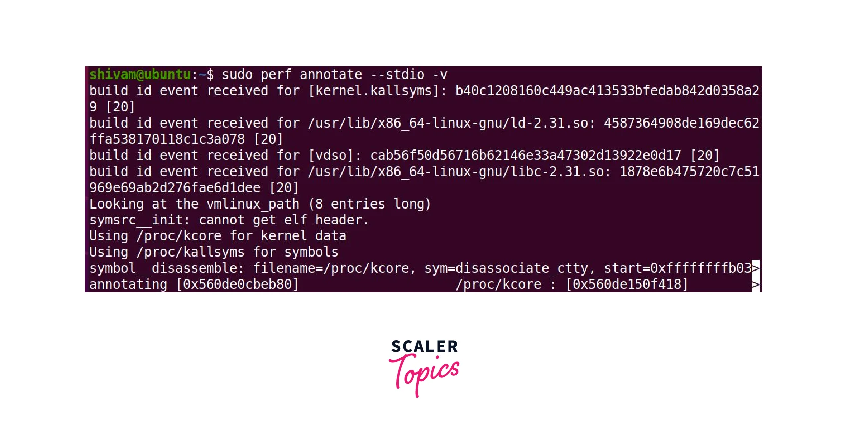 When you use the perf annotate command with the -v option, it provides a detailed output that contains both the source code and the disassembly of the recorded events.