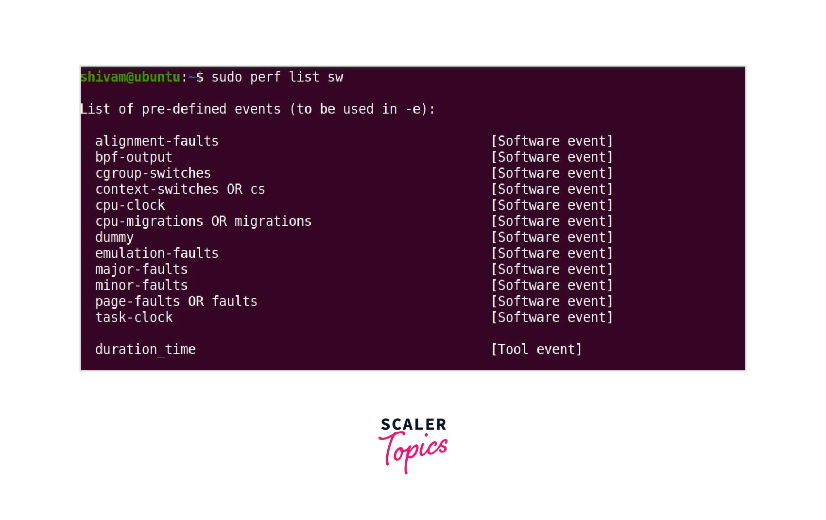 To get a list of all measurable events, use perf with the list subcommand. This subcommand displays a comprehensive list of event types that can be used for profiling or monitoring. To list the events, open a terminal and run the following command: