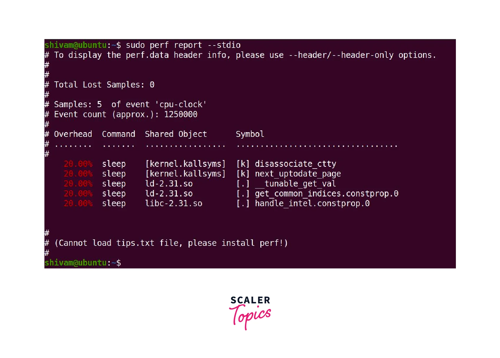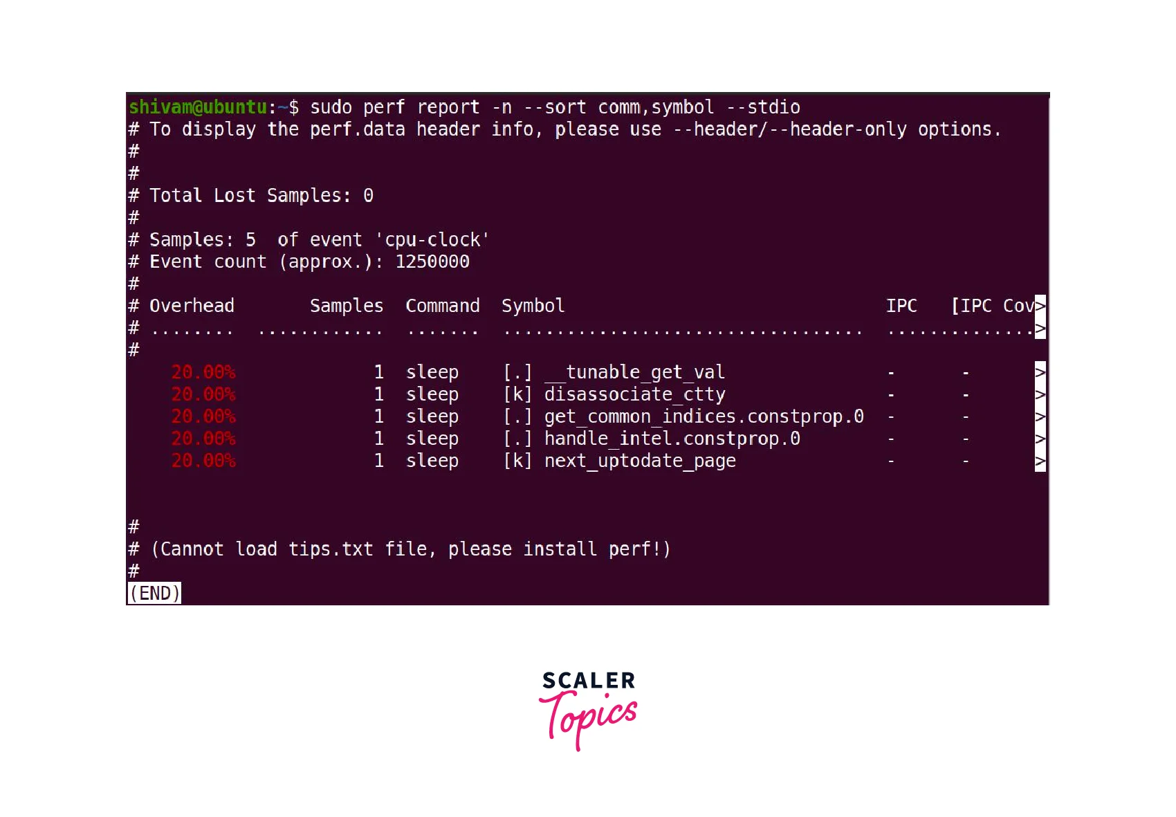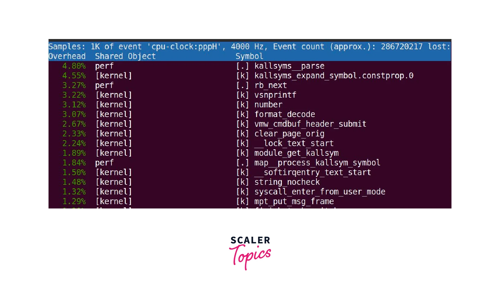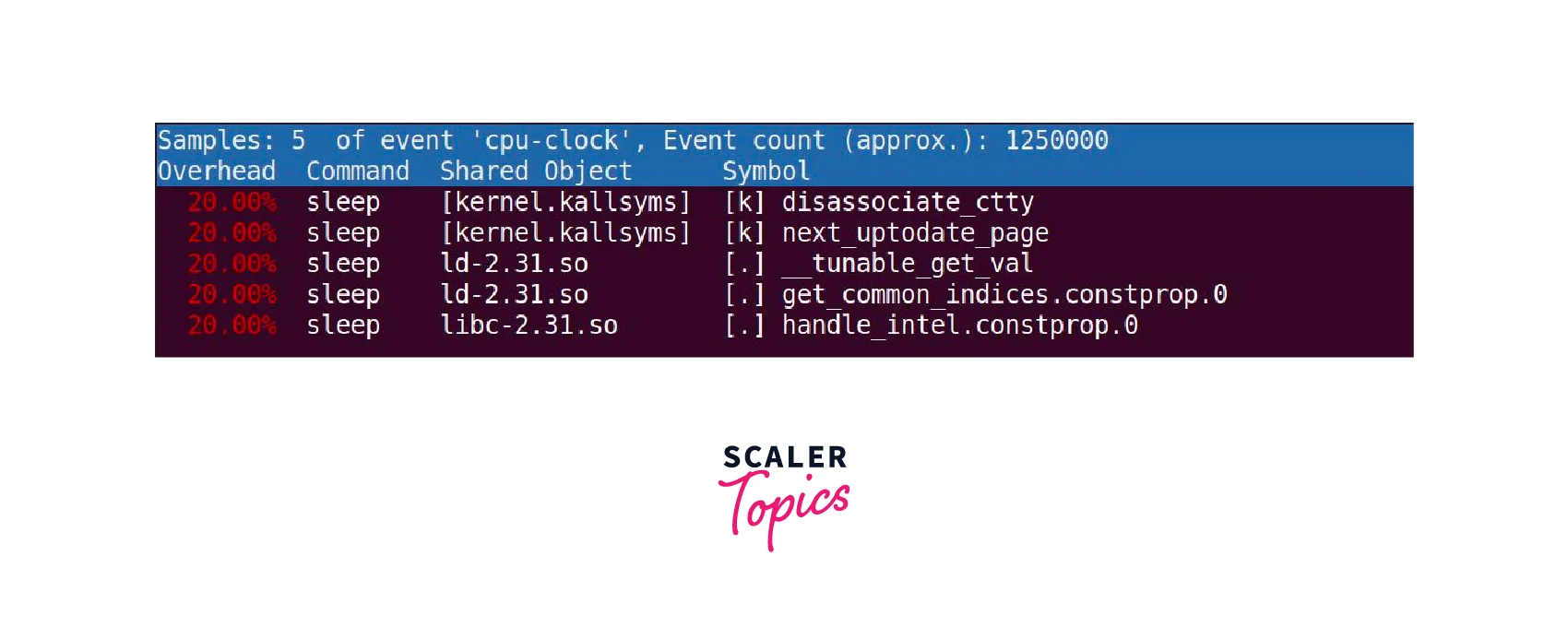 The output of perf top shows a comprehensive report for the entire system, gathered in five seconds. By default, it captures and displays performance data for the specified duration. Alternatively, if the sleep 5 command is not used, the perf top will continue to measure and gather data until it is manually terminated by pressing CTRL+C.