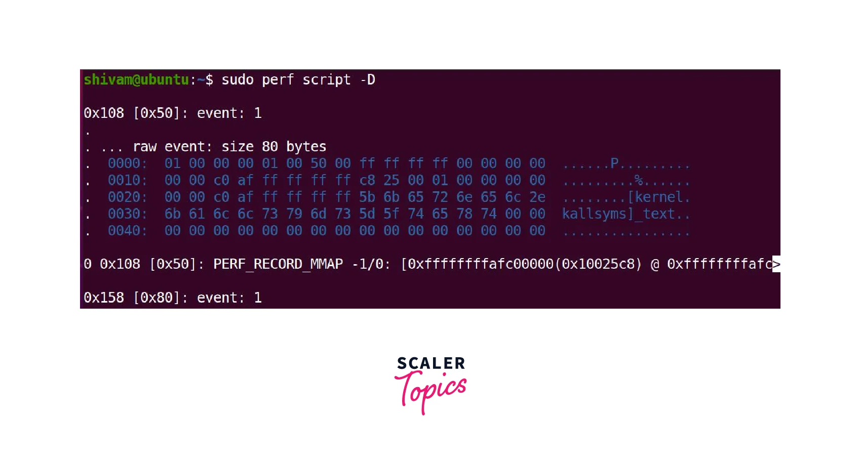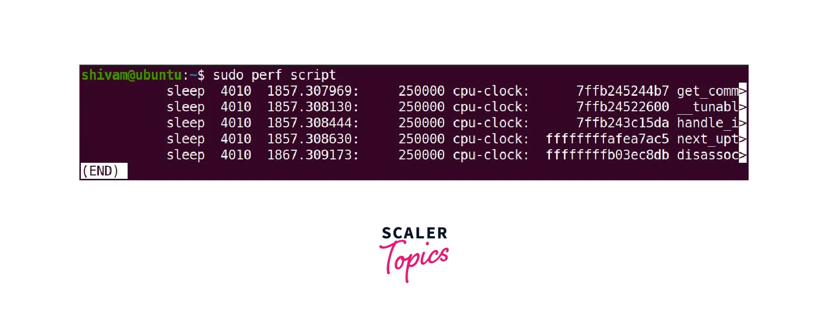 The output displays the perf.data details in order of time. Use the script subcommand as post-processing data.