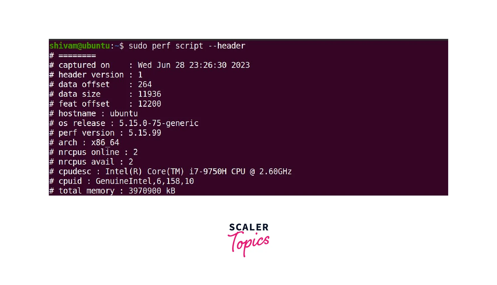 The output of the perf script --header command includes the header information of the file, which provides details about the trace session. This information typically comprises the start time of the trace, its duration, CPU-related statistics, and the command that generated the data.
