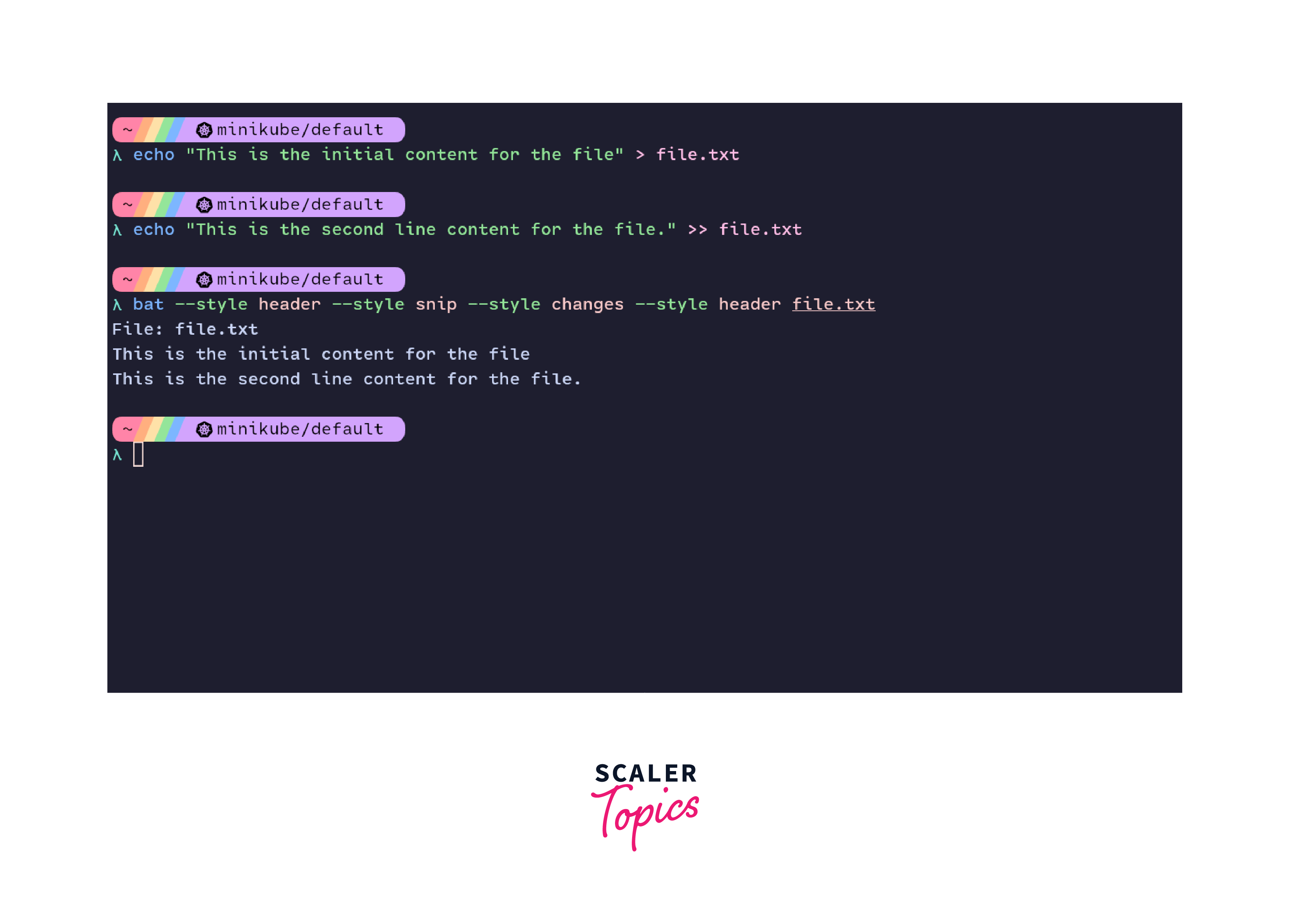 Here, we are populating a file with some strings. Now, we wish to append more data to this file without losing the existing data. In this case, we redirect the Linux I/O stream using the append redirection method to update our existing file.