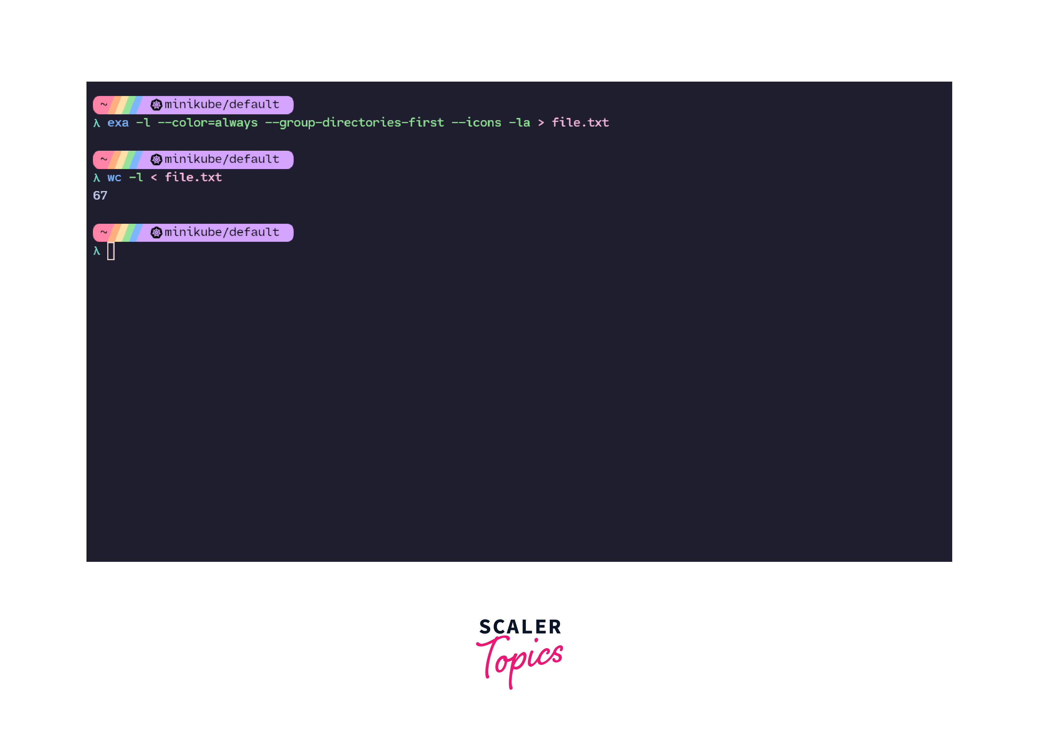 Here, we are using the command line tool wc to count the number of lines that are added to file.txt when we used the output redirection. The wc tool is a command line program that stands for word count. The wc -l command returns the number of lines that are present in the file that we pass into the command. In wc -l, the input to the program goes from a file using input redirection instead of being sent from the terminal.
