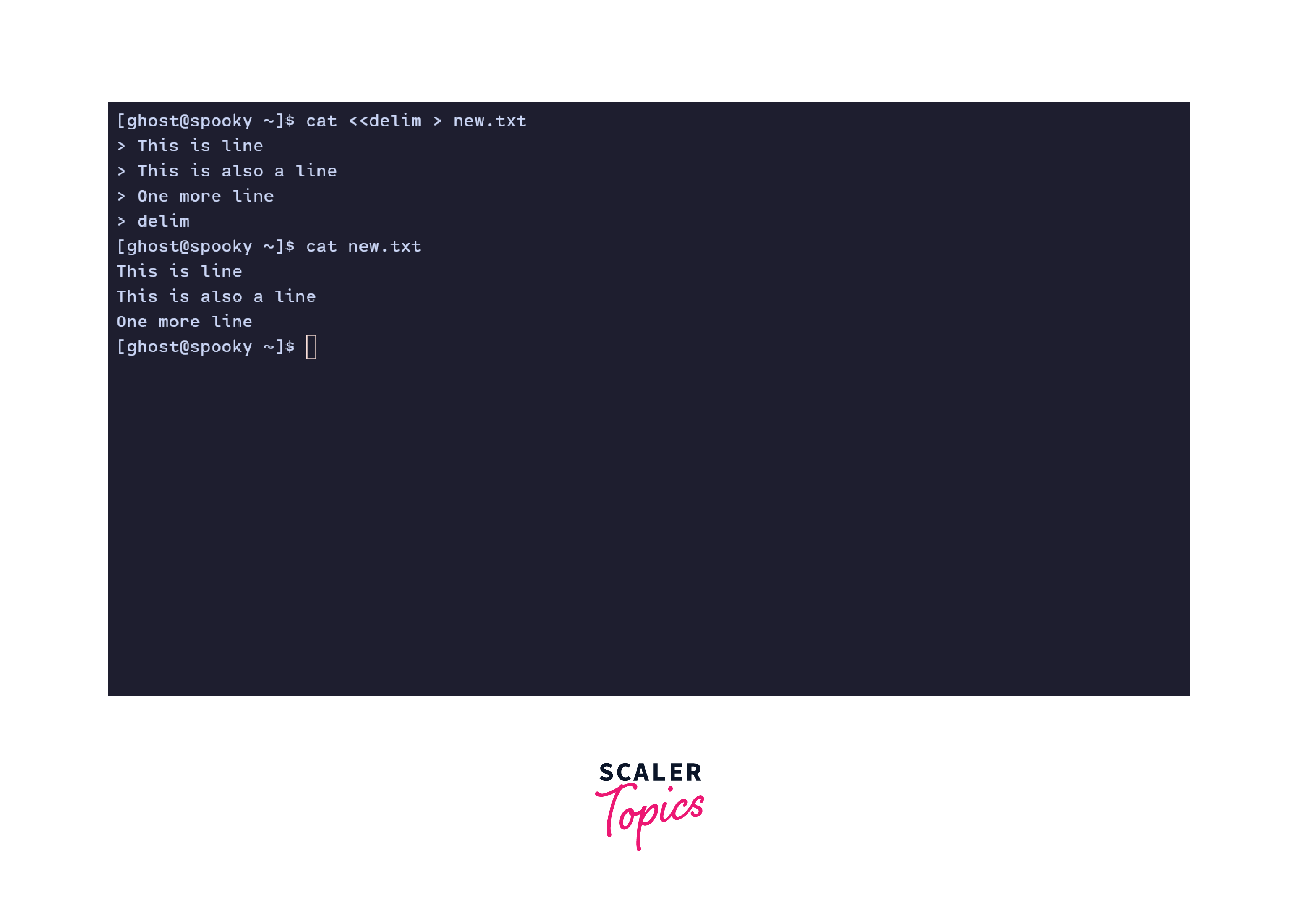 In this example, we are using append redirection along with a delimiter, 'delim' to input multiple lines into the cat command. The input to the cat command is being redirected to a file named 'new.txt'.