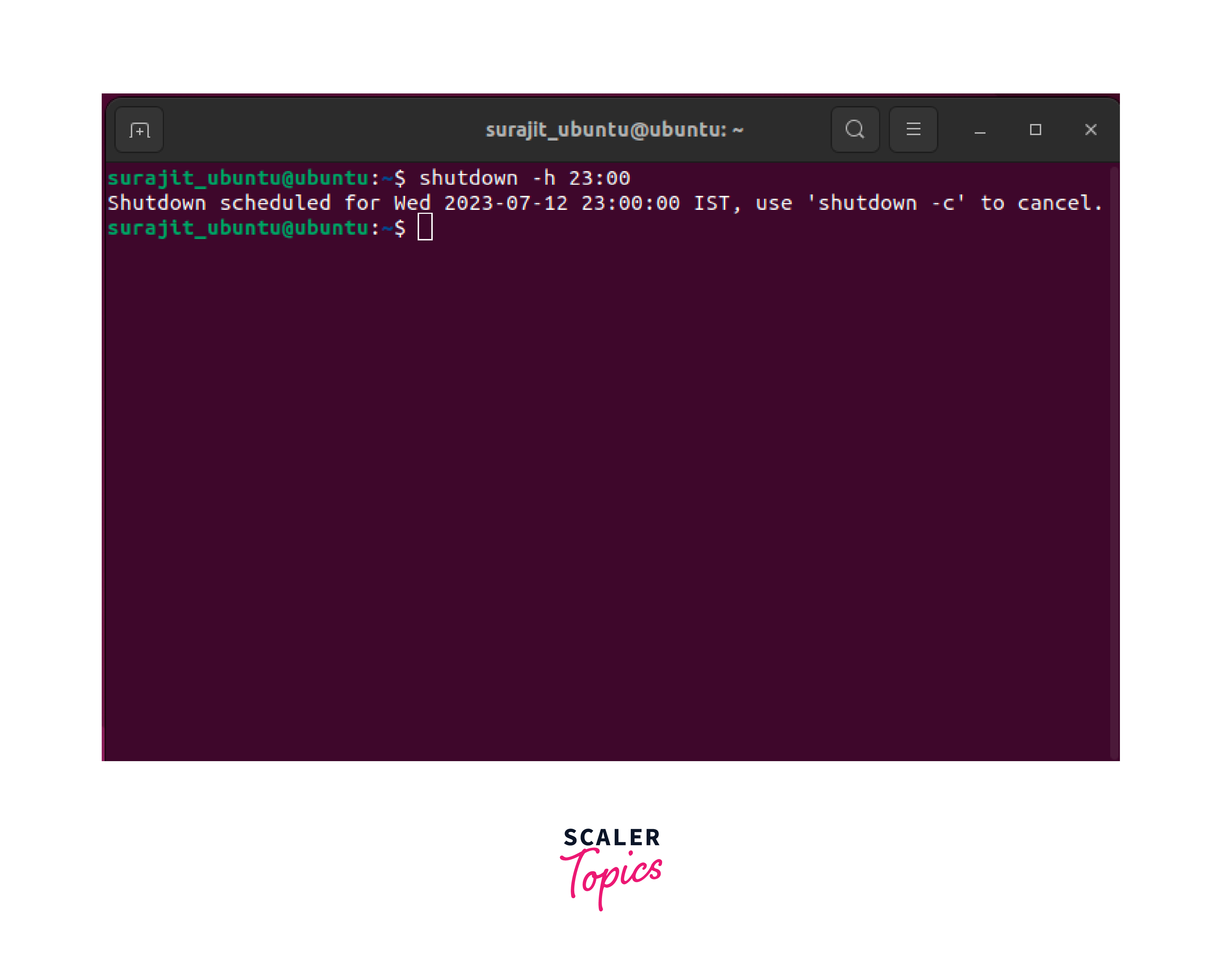 23:00: This is the time argument provided to the command, indicating the specific time at which the system should be shut down. In this case, it is set to 23:00, which represents 11:00 PM in a 24-hour clock format.