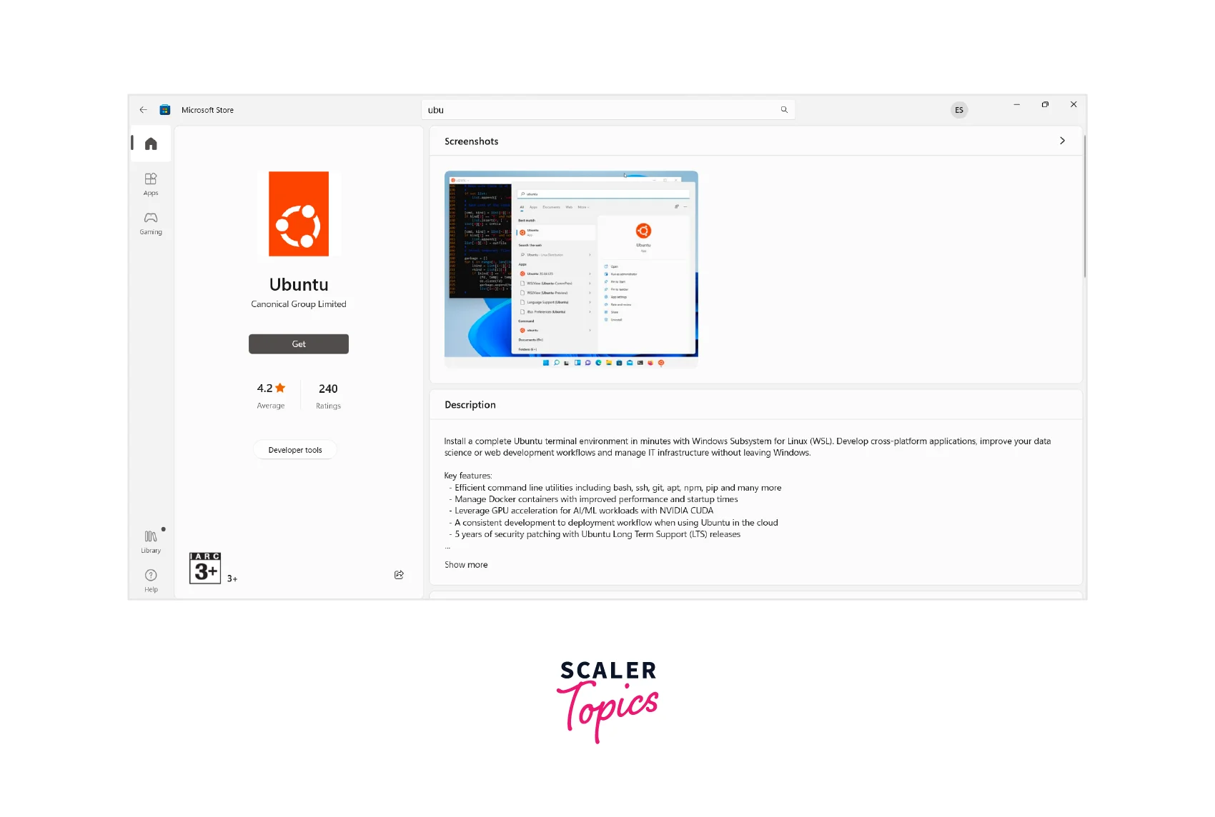 - Search for "Ubuntu" and select the "Ubuntu" app from Canonical.