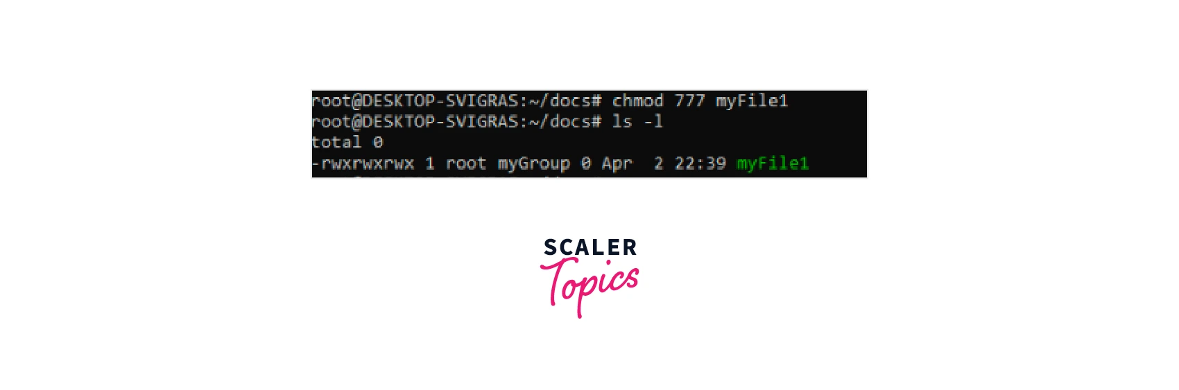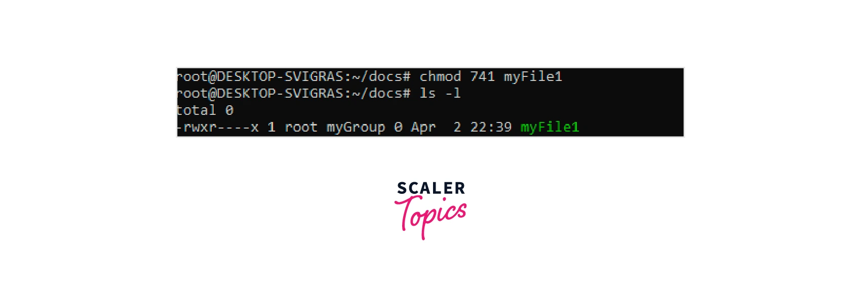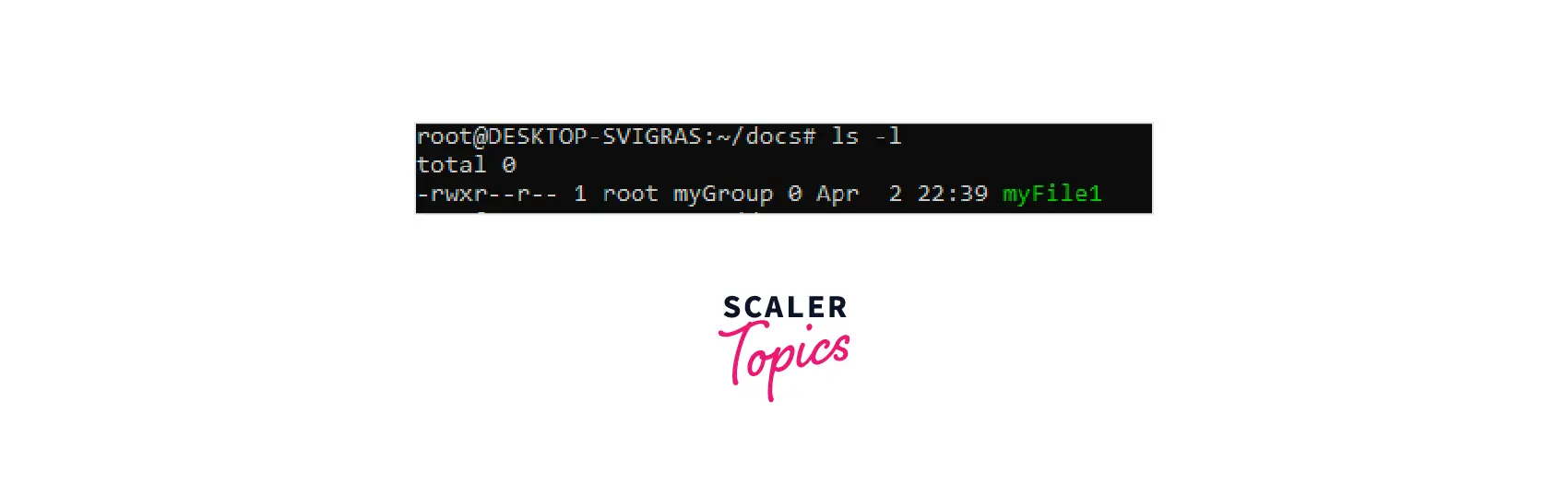 Here we have given read write and execute permissions to the root user, myGroup group, and other users also using the other command.