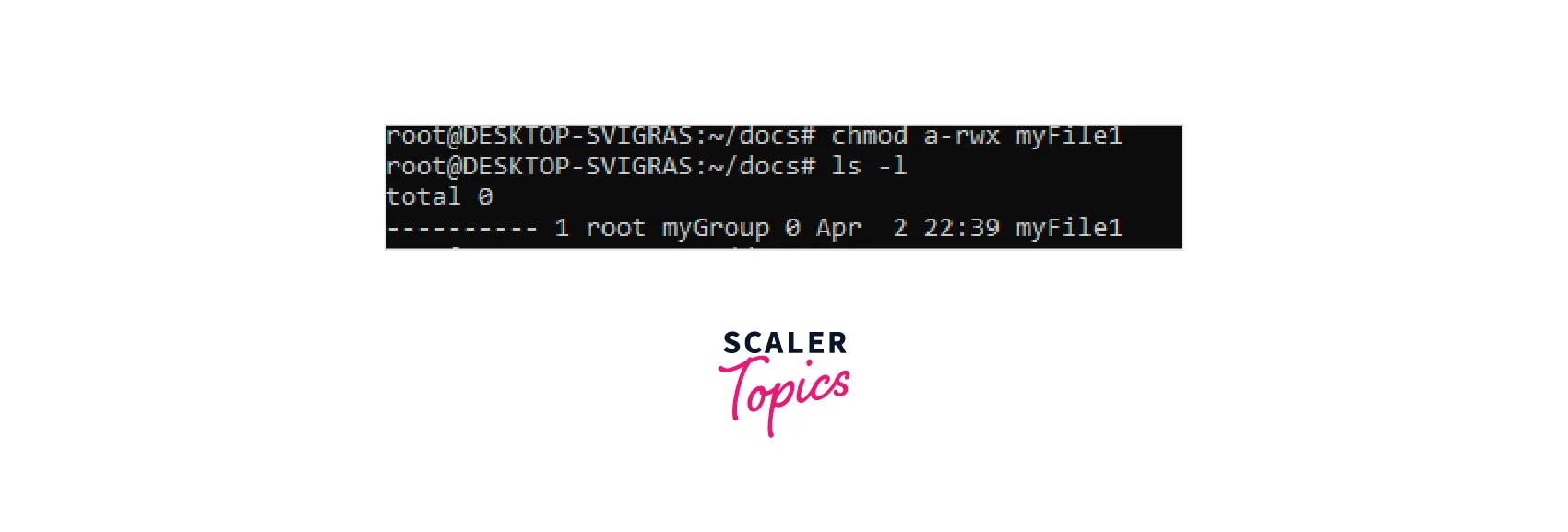 In this specific command, a stands for all (owner, groups, and others), and -rwx stands for removing read, write, and execute permissions from all users, groups, and others. Therefore, the a-rwx part of the command means that all users and groups will have their read, write, and execute permissions revoked.