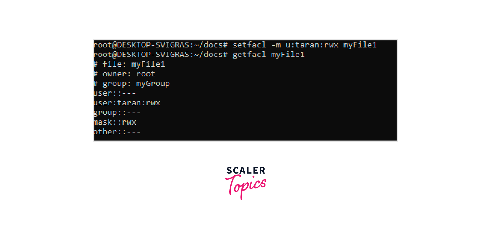 Hence, we can see that from the above command, the user taran will be having to read, write, and execute permissions on myFile1.