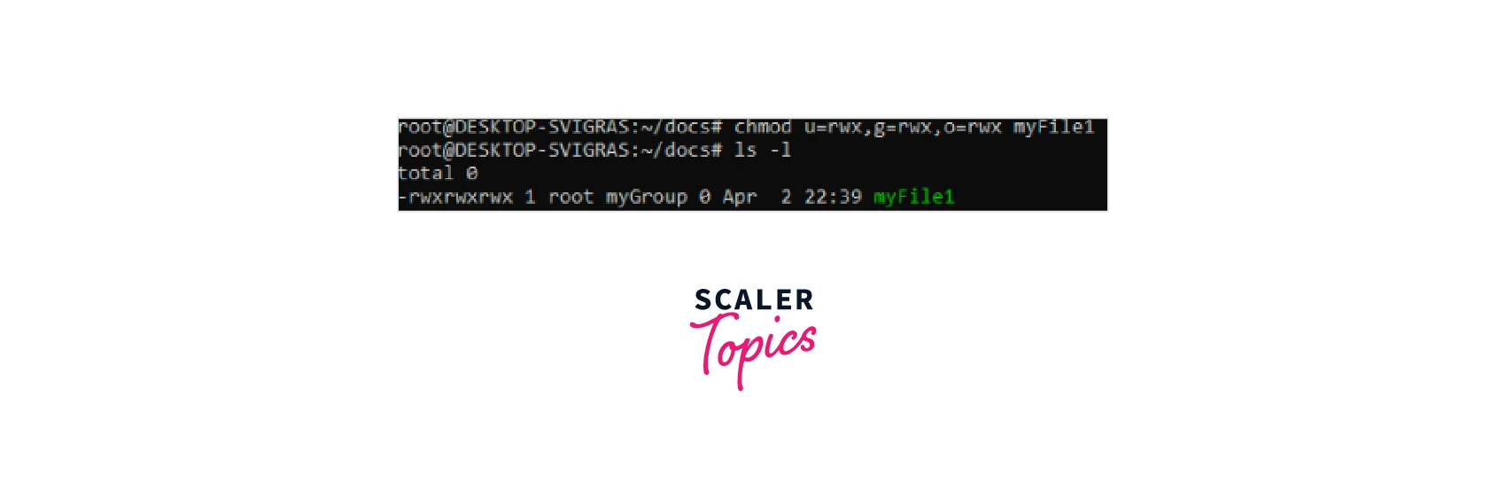 In this example, we are changing the user permission of a file by setting the file permissions to users, groups, and others.