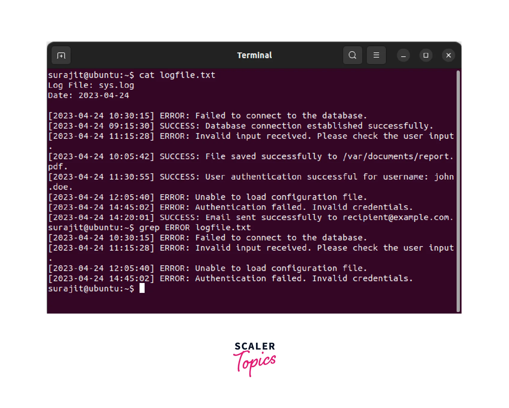 grep - The grep command in Linux is used to search for a pattern in a file or stream. For example, running grep ERROR logfile.txt in the terminal will search for the word "ERROR" in the "logfile.txt" file and will print any matching lines on screen. Its syntax is grep [options] pattern [file].