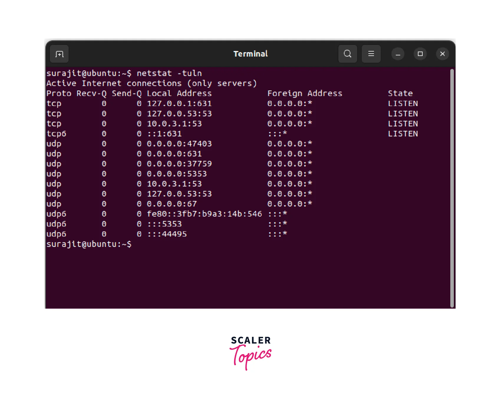 netstat - It is a Linux command used to display network connections and related network statistics. As an example: netstat -tuln; shows a list of all TCP (t) and UDP (u) listening (l) and established (n) connections present in the network.