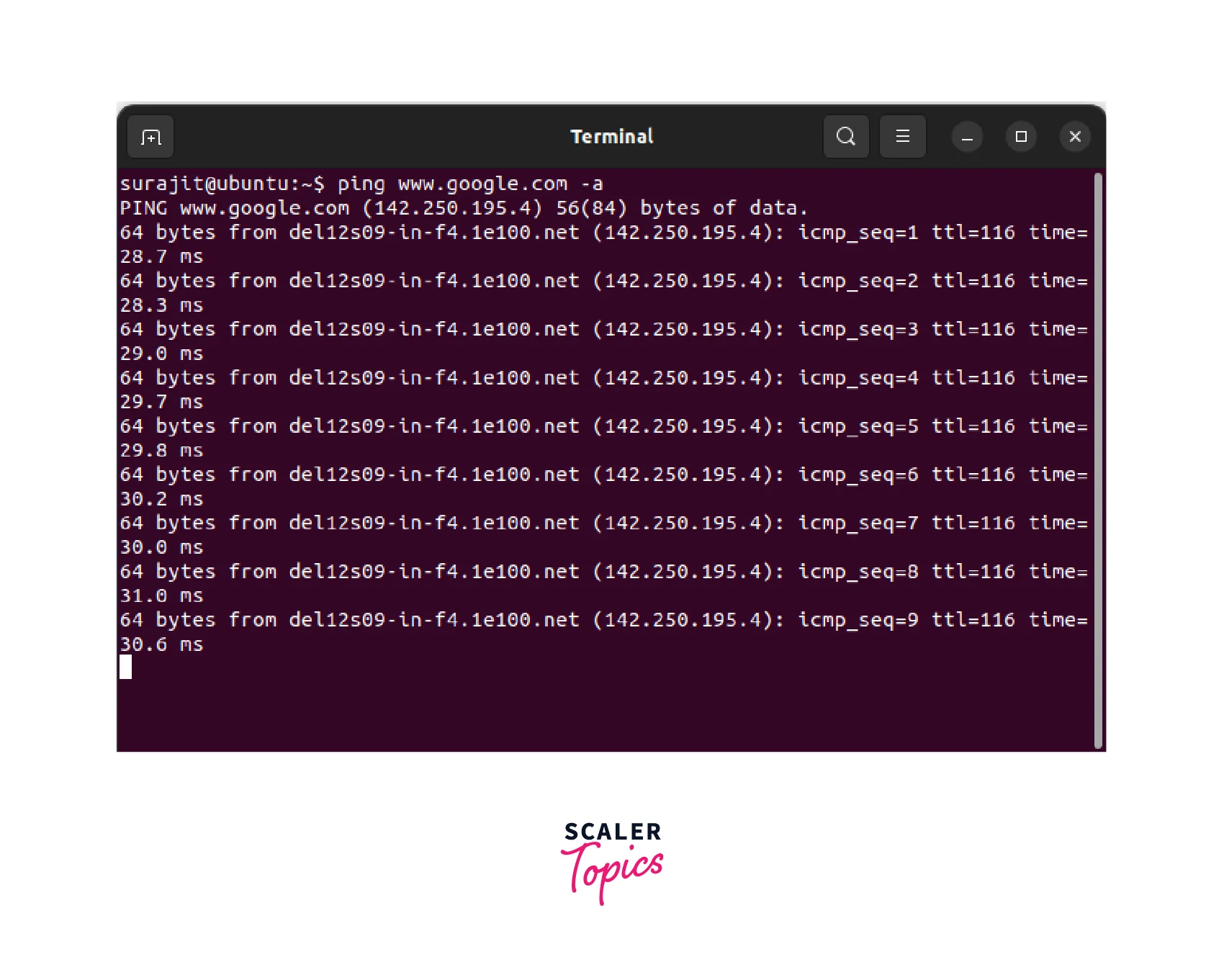 Options include setting packet size, interval, count, and more. Ping is commonly used for network troubleshooting, diagnosing network connectivity issues, and measuring network latency. Note: 'Ping' requires root or superuser privileges to send ICMP Echo Request packets, and some hosts or firewalls may block ICMP traffic. The syntax of the command is: ping [options] [host].