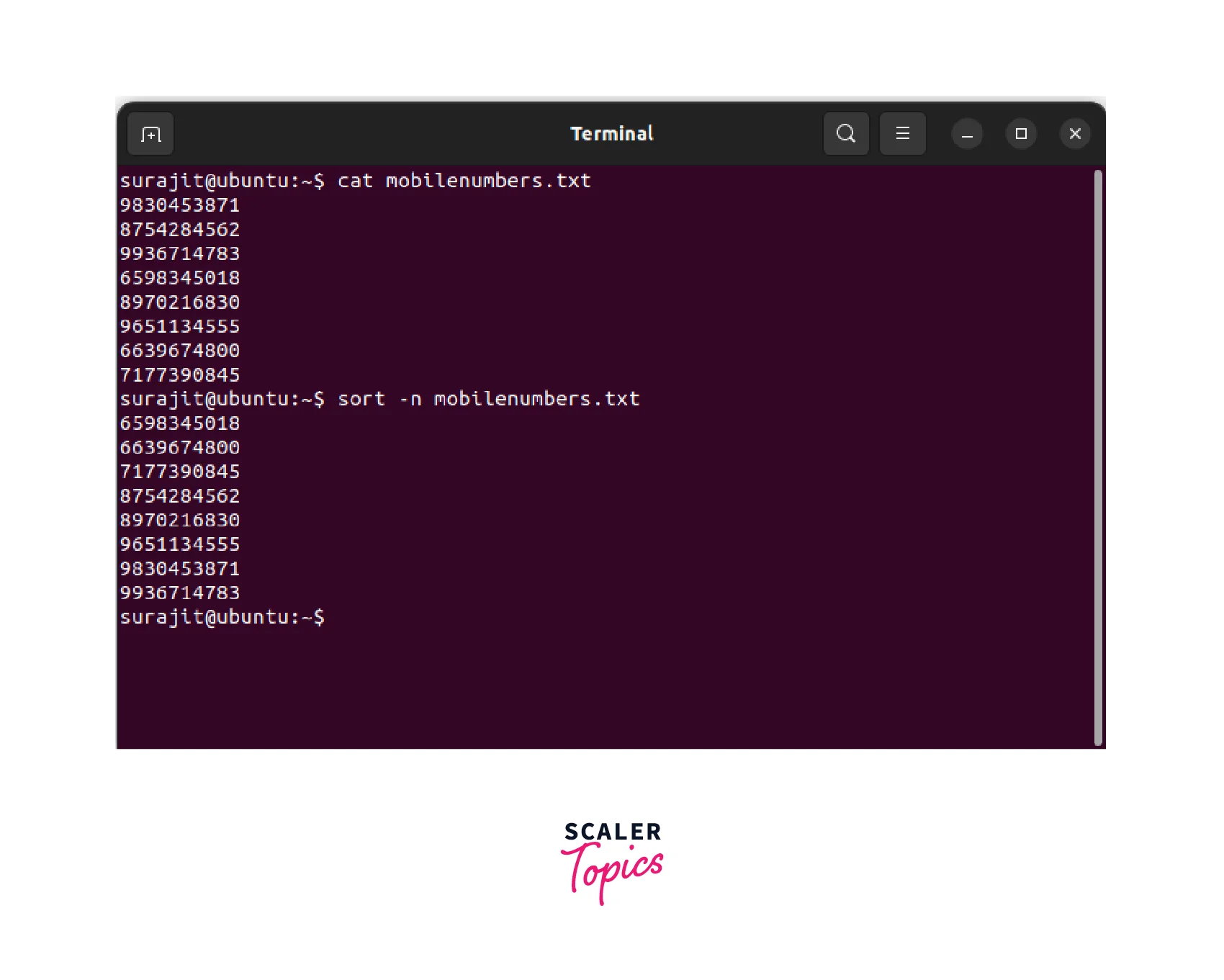 sort - The sort command in Linux is used to sort the lines of a text file in ascending or descending order based on certain criteria. The syntax is sort [options] [file] where "options" are used to specify the sorting criteria and "file" is the name of the file to be sorted. Example: sort -n mobilenumbers.txt sorts the lines of the "mobilenumbers.txt" file in numerical order.