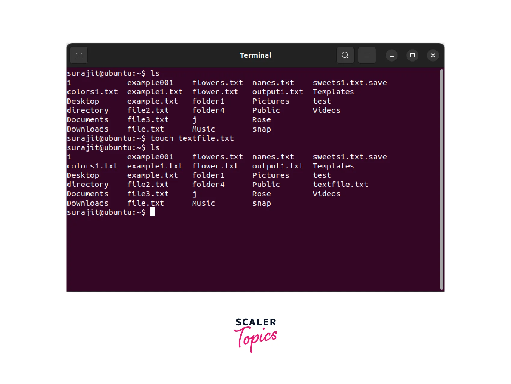 touch - This command in Linux is used to create a new empty file or update the modification time of an existing file. For example, touch textfile.txt creates a new empty file called "textfile.txt" in the current working directory, or updates the modification time if the file already exists. The syntax used is: touch [filename]