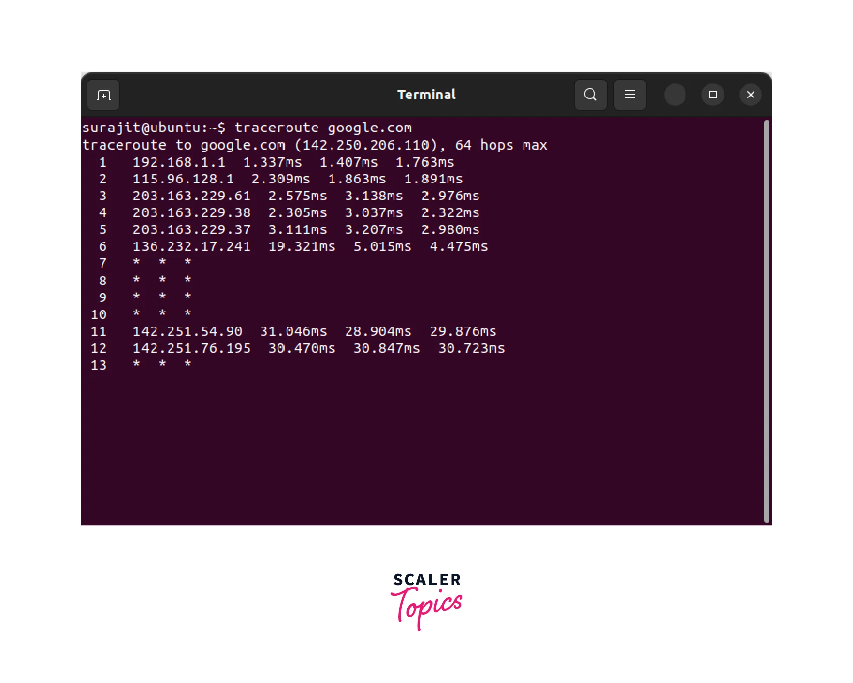 traceroute - This is a Linux command used to trace the route that packets take from a source host to a destination host over an IP network. For an Example: "traceroute google.com" traces the route that packets take to reach the "google.com" domain, displaying the IP addresses of intermediate hops along with their response times.
