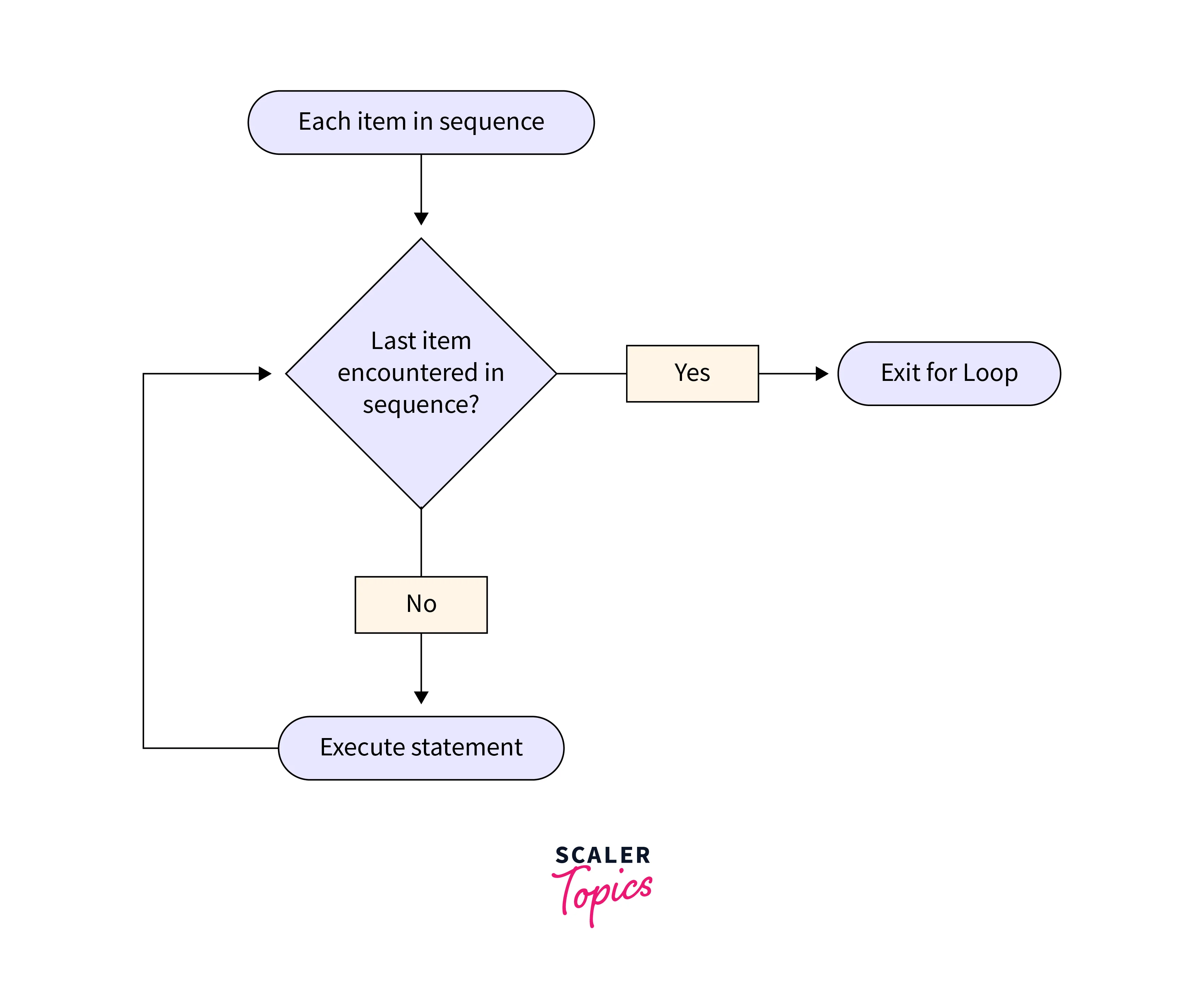 In this flow chart, the working of the 'for' loop is demonstrated. First, an iterator iterates on each item one-by-one in the sequence and then checks if it is the last item of the sequence or not. If the current value of an iterator is the last value of the sequence, then loops will stop; otherwise, the iterator will go inside the loop and repeat the whole process for the next value.