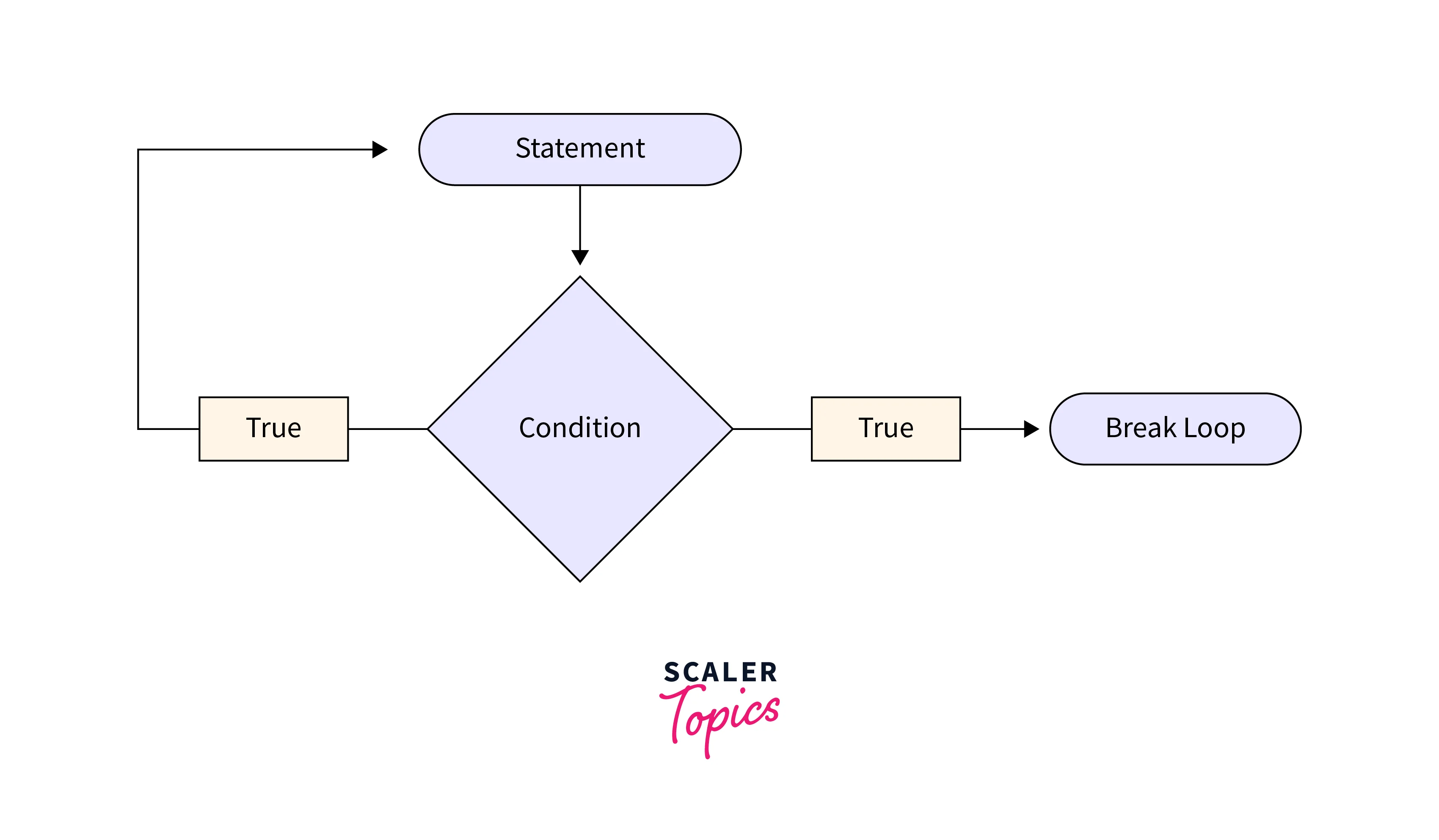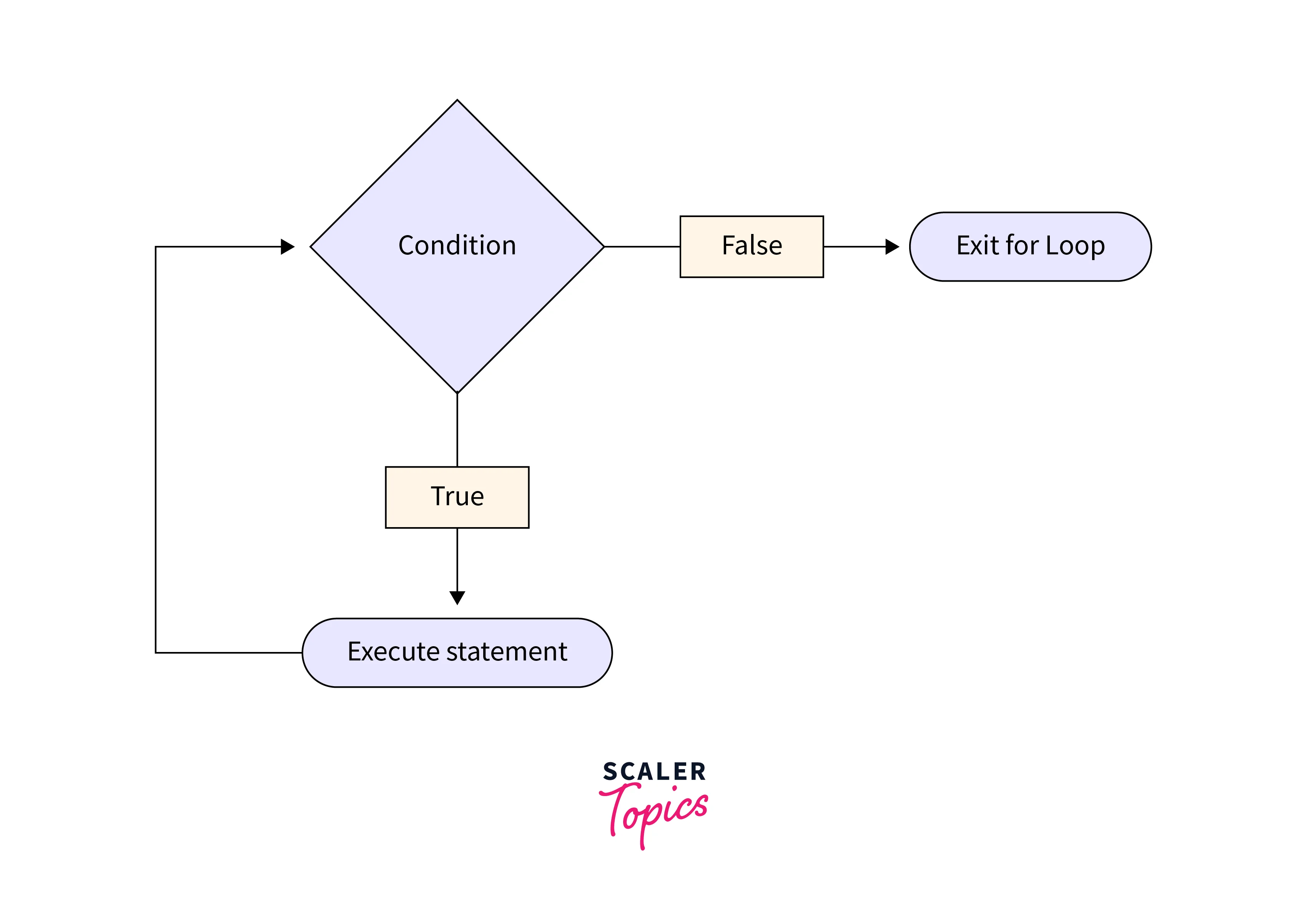 In this flow diagram, the working of the 'while loop' is demonstrated. The first step is to check the condition for the current value of the iterator. If the condition is false, then simply break the loop; otherwise, go inside the loop, execute the statement for the current value of the iterator, then iterate back to the loop and repeat the process for the next value.