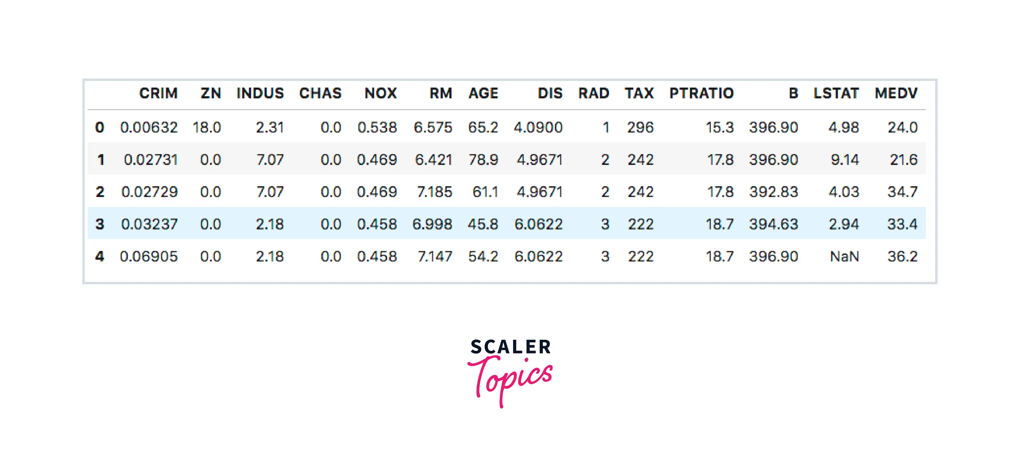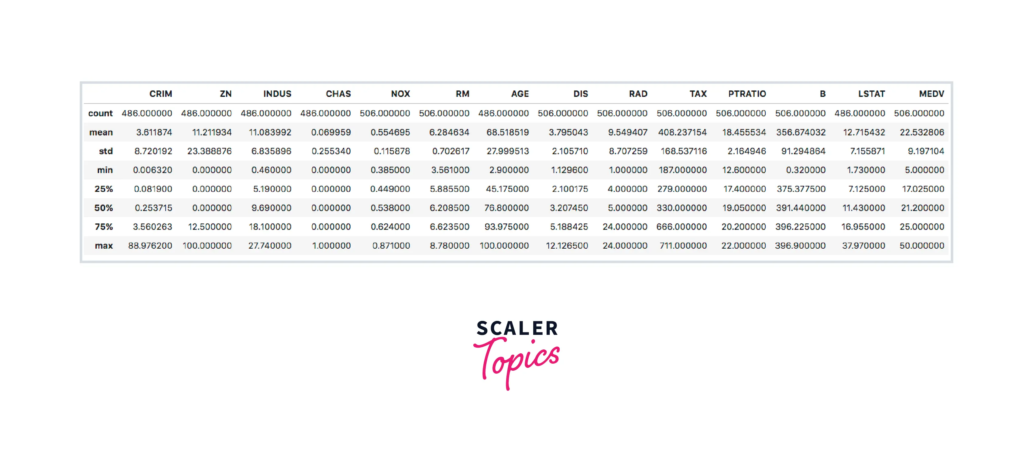 The Boston Housing Data has 506 rows and 14 columns. All the values are either integers or float.
