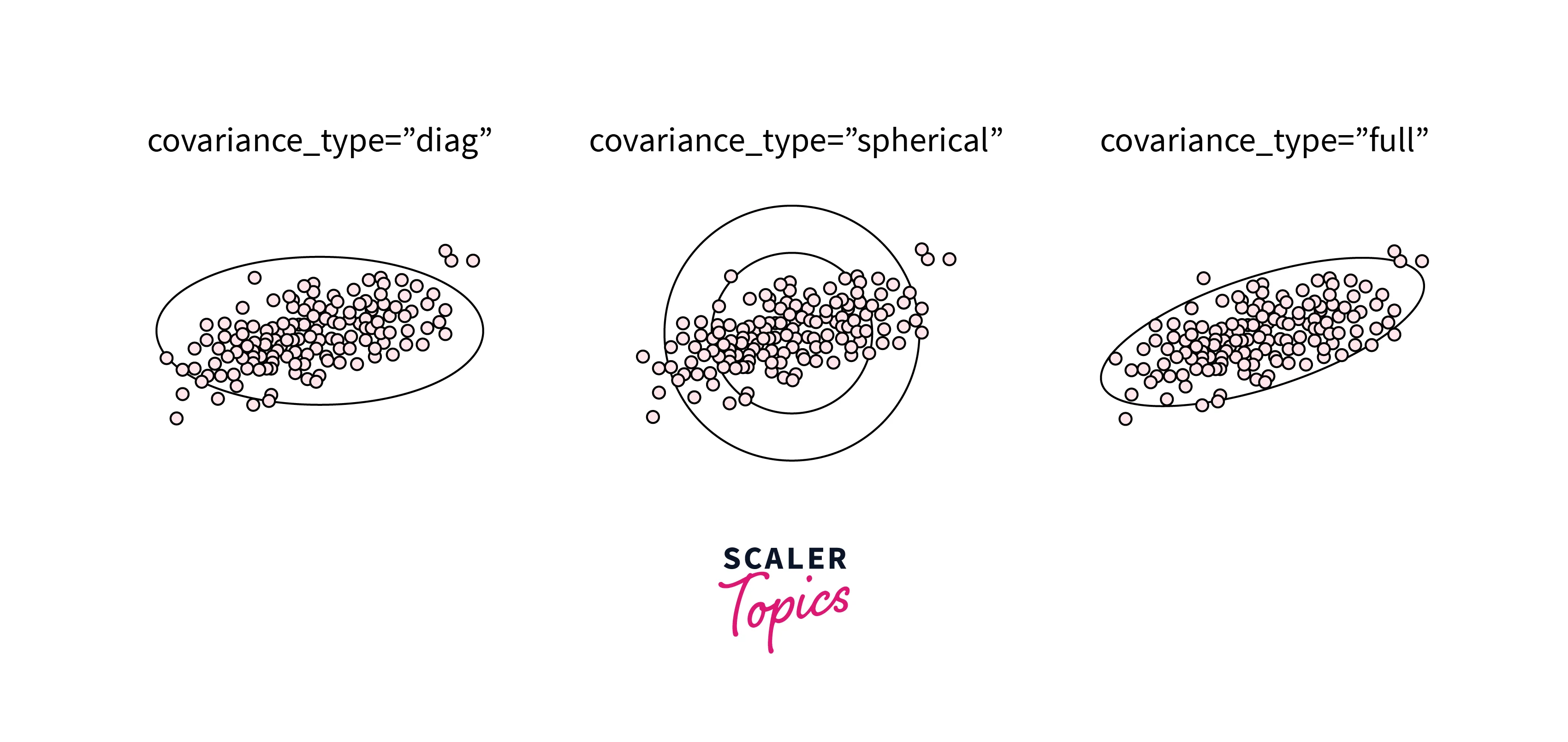 - The default is covariance_type="diag", which means that the size of the cluster along each dimension can be set independently, with the resulting ellipse constrained to align with the axes.