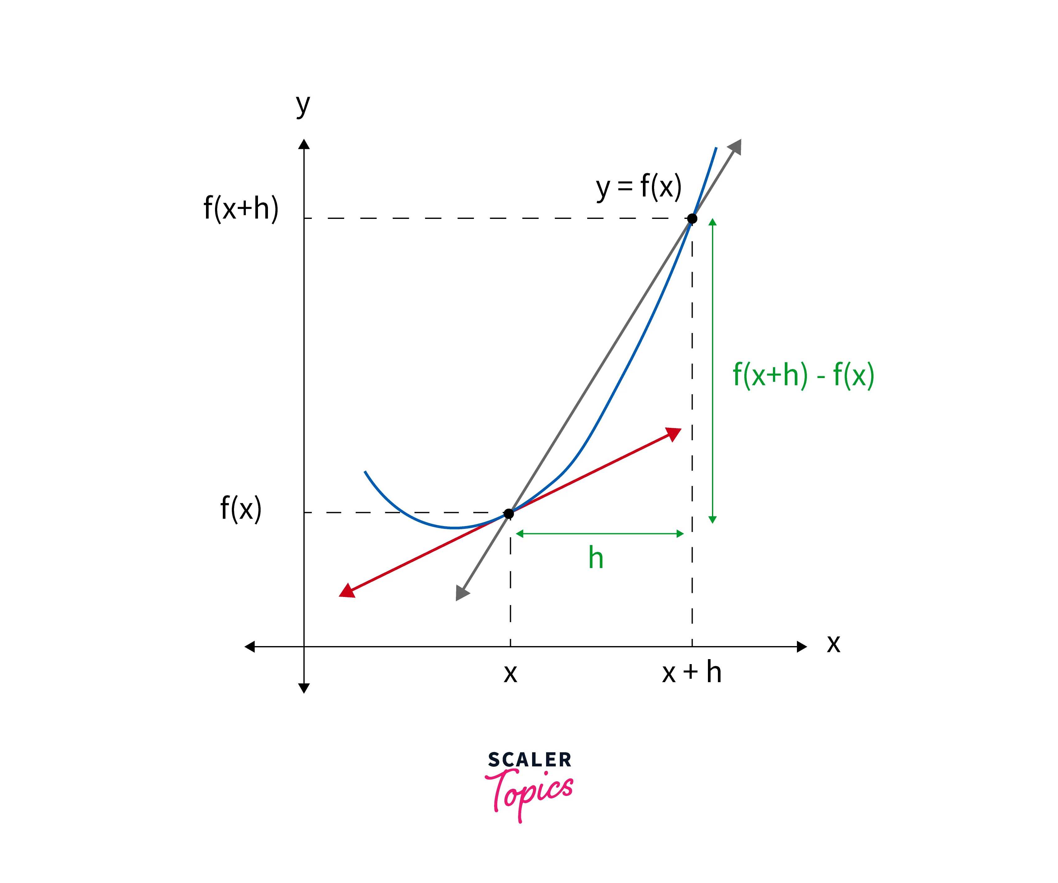 In fig above, let two points on the curve be and , . Here, the slope of the second line through these two points is given by . If we observe closely when the distance between two points tends to 0 (i.e., as h approaches 0), the second point overlaps the original point, and the secant line becomes the tangent line. The tangent line's slope is called the derivative of the function.