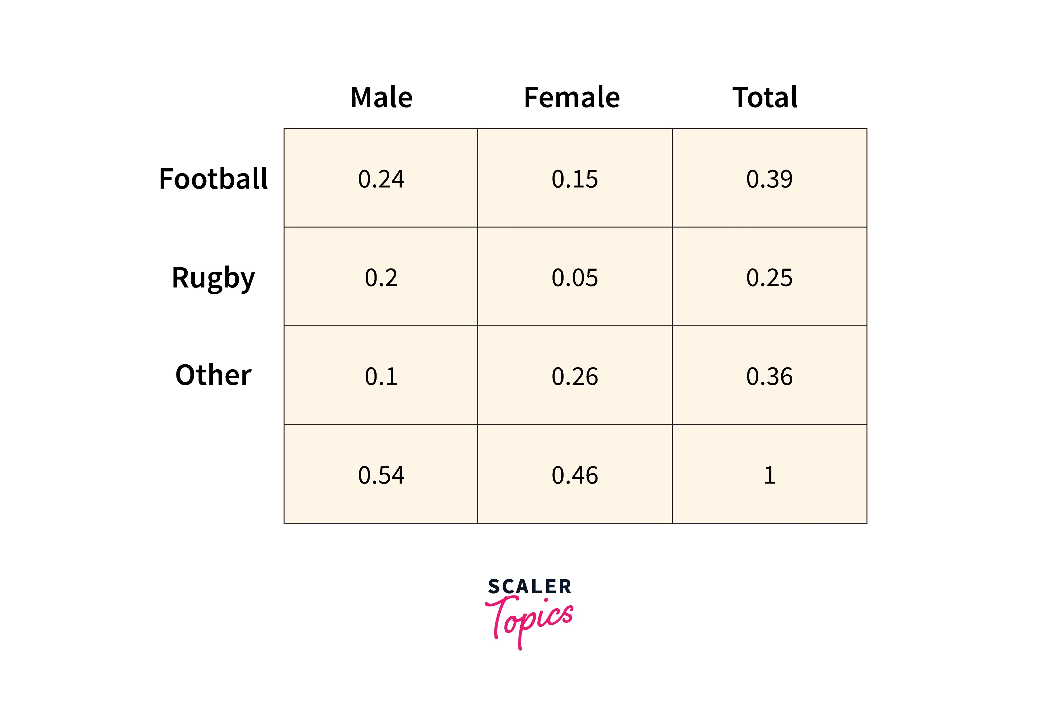 Suppose we are interested in calculating the probability that a person would like Football given that they are a male, i.e., .To calculate this using the conditional probability formula, we divide the joint probability of "the person is male and likes football" by the probability of "the person is male." Hence, .