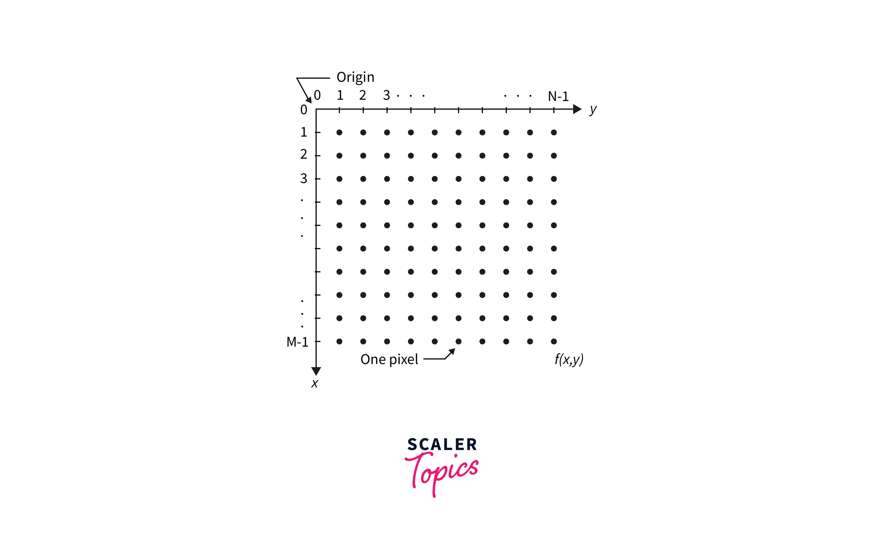 An image comprises a rectangular array of dots known as pixels and is also defined as a two-dimensional function. To represent digital images, we mostly use two methods. Suppose a digital image with M rows and N columns is created by sampling the image f(x, y). The values of the coordinates (x, y) are now discrete quantities. We will utilize integer values for these discrete coordinates to simplify the notation and make things easier. As a result, the coordinates at the origin have the values (x, y) = (0, 0). The following coordinate values along the image’s first row are shown as (x, y) = (0, 1). It’s crucial to remember that the second sample along the first row is denoted by the notation (0, 1). It doesn’t necessarily imply that these were the physical coordinate values when the image was captured.