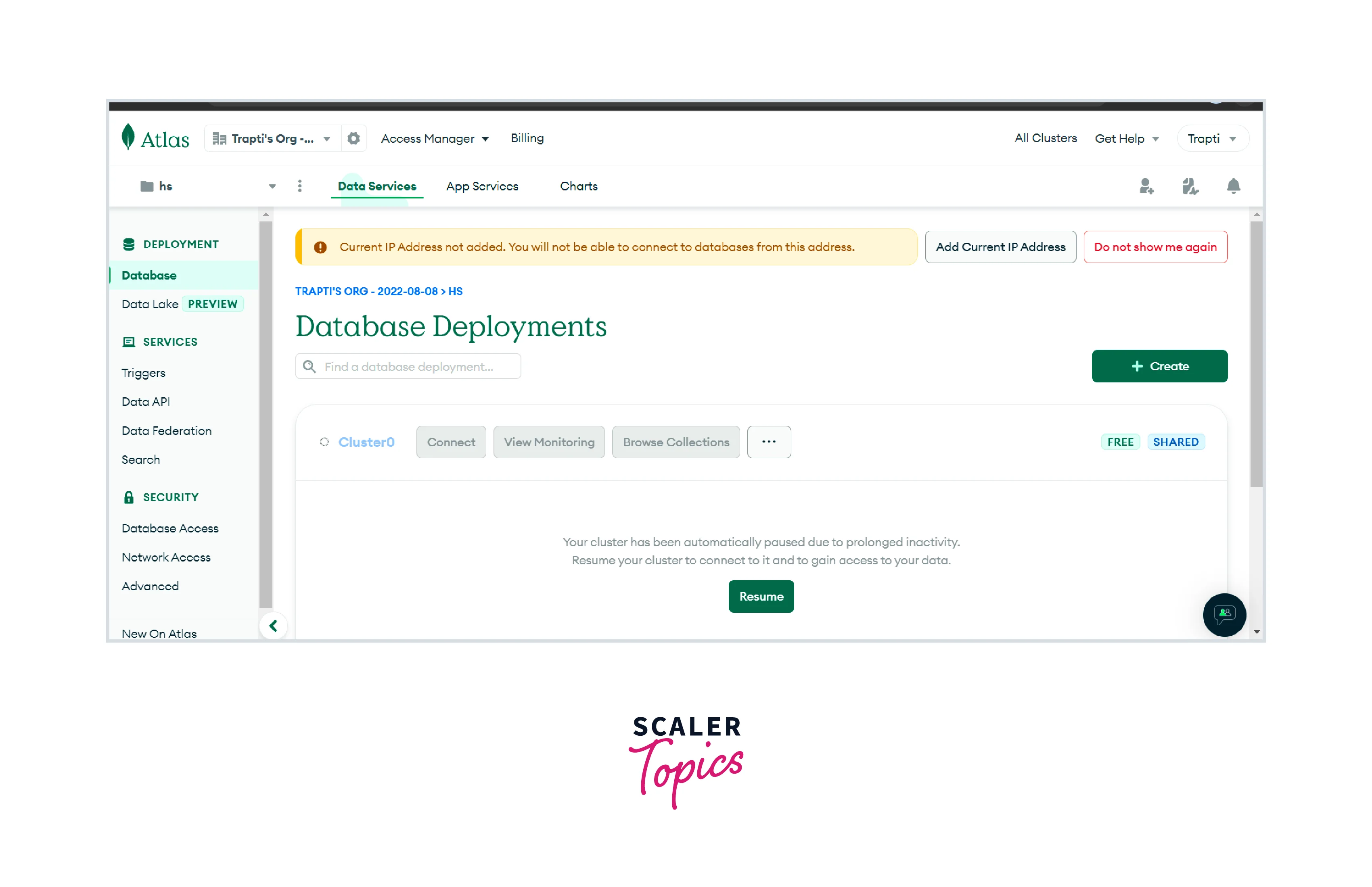 We can define the MongoDB Atlas cluster as a NoSQL database-as-a-service available in the public cloud (such as Amazon Web services, Google cloud platform, etc). You can set up a working MongoDB Cluster within a few clicks. It is a managed MongoDB facility and can be accessed from any web browser. If you want to connect with MongoDB then you do not need to install any software on your system as you can directly connect with it using the web user interface On the other hand, if you want to work with the command line, then you can create a connection with the help of the Mongo shell. And for this purpose, you have to configure the firewall present in the web portal so that it can accept your IP. Move to the security from the homepage and then move to network access. At last click on the “Add IP Address” option and finally, you can add your IP After that write the configuration settings given below in the Mongo shell command line.