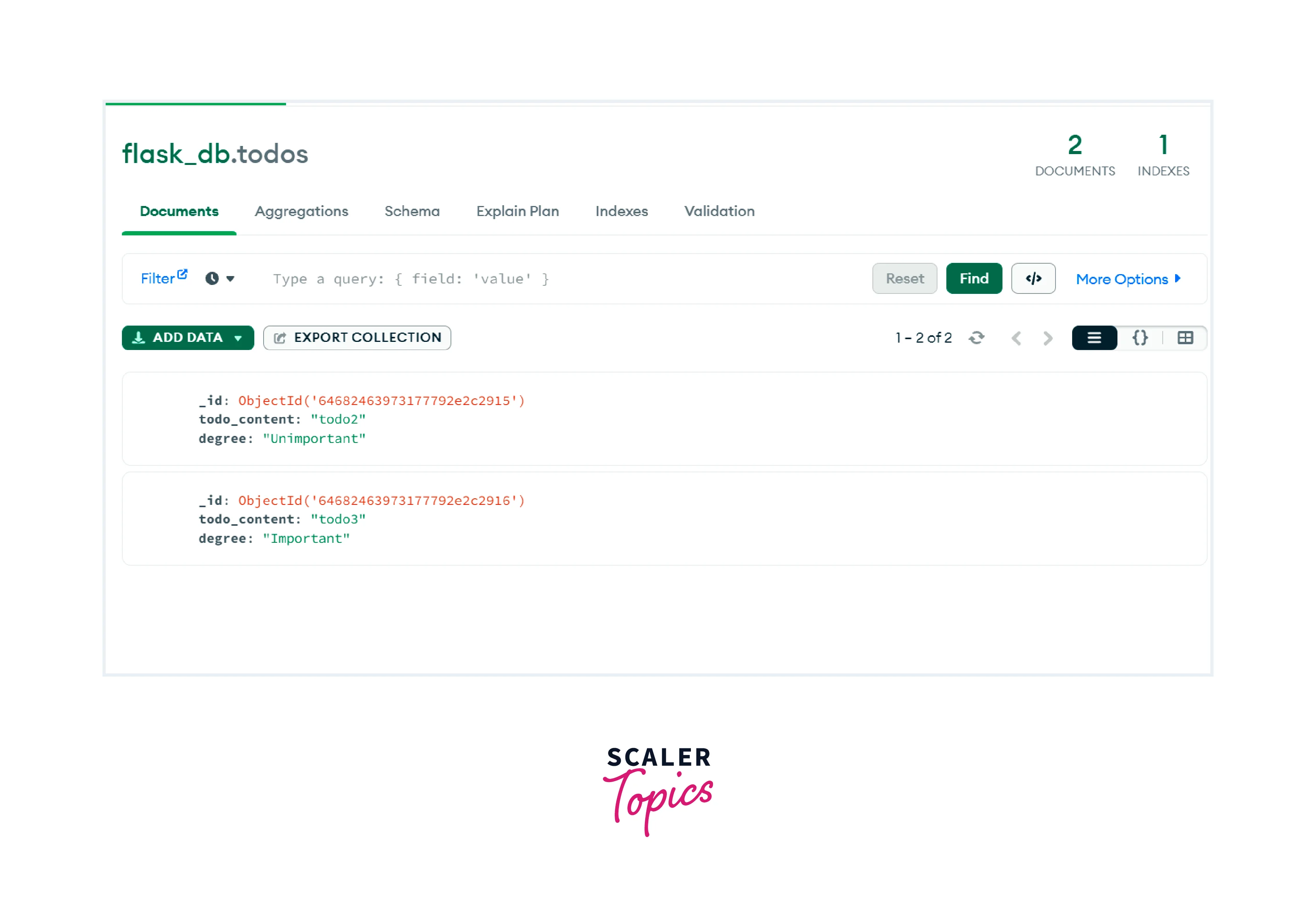 A MongoDB database named flask_db can be created by using the client instance. And in a variable db, save a reference to it. With the help of the db variable, a collection named todos can be created on flask_db. A group of documents in MongoDB is stored in the MongoDB collection, such as tables present in relational databases.