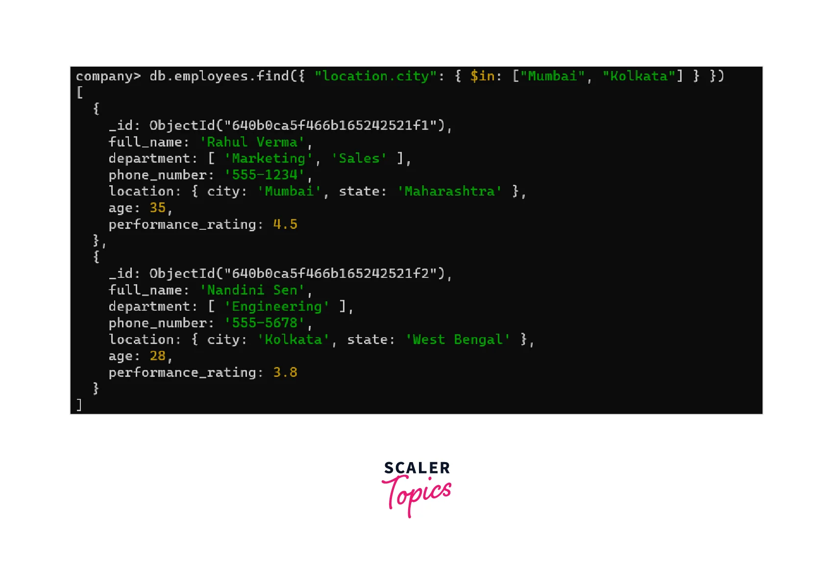 Suppose we want to find all employees who are located in either "Mumbai" or "Kolkata". We can do this by using the $in operator to match the location. city field against an array of possible values: