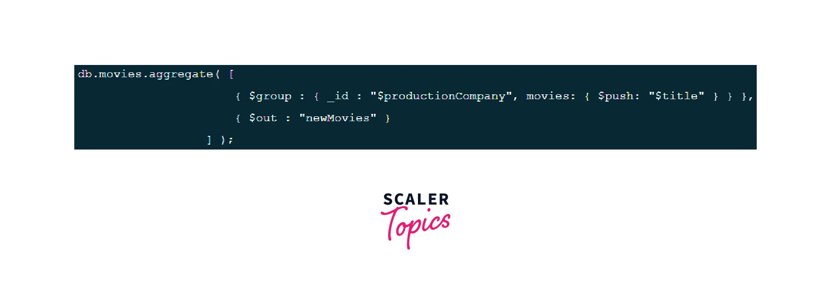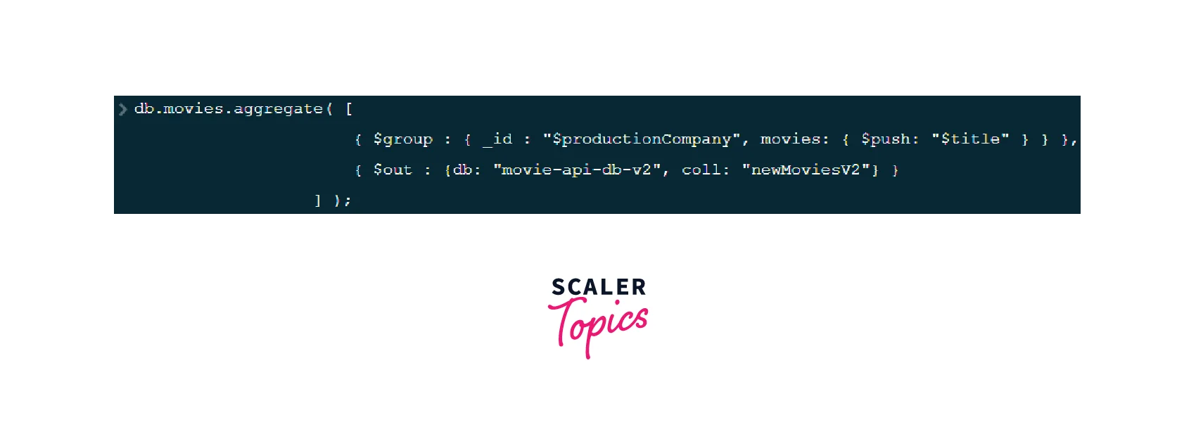 This aggregation operation pivots the data in "movies" collection to have "title" grouped by "productionCompany" and then the out stage is used to save the aggregate output in a new collection in MongoDB, in this case, the results are written into the "newMoviesAggregate" collection in the database.