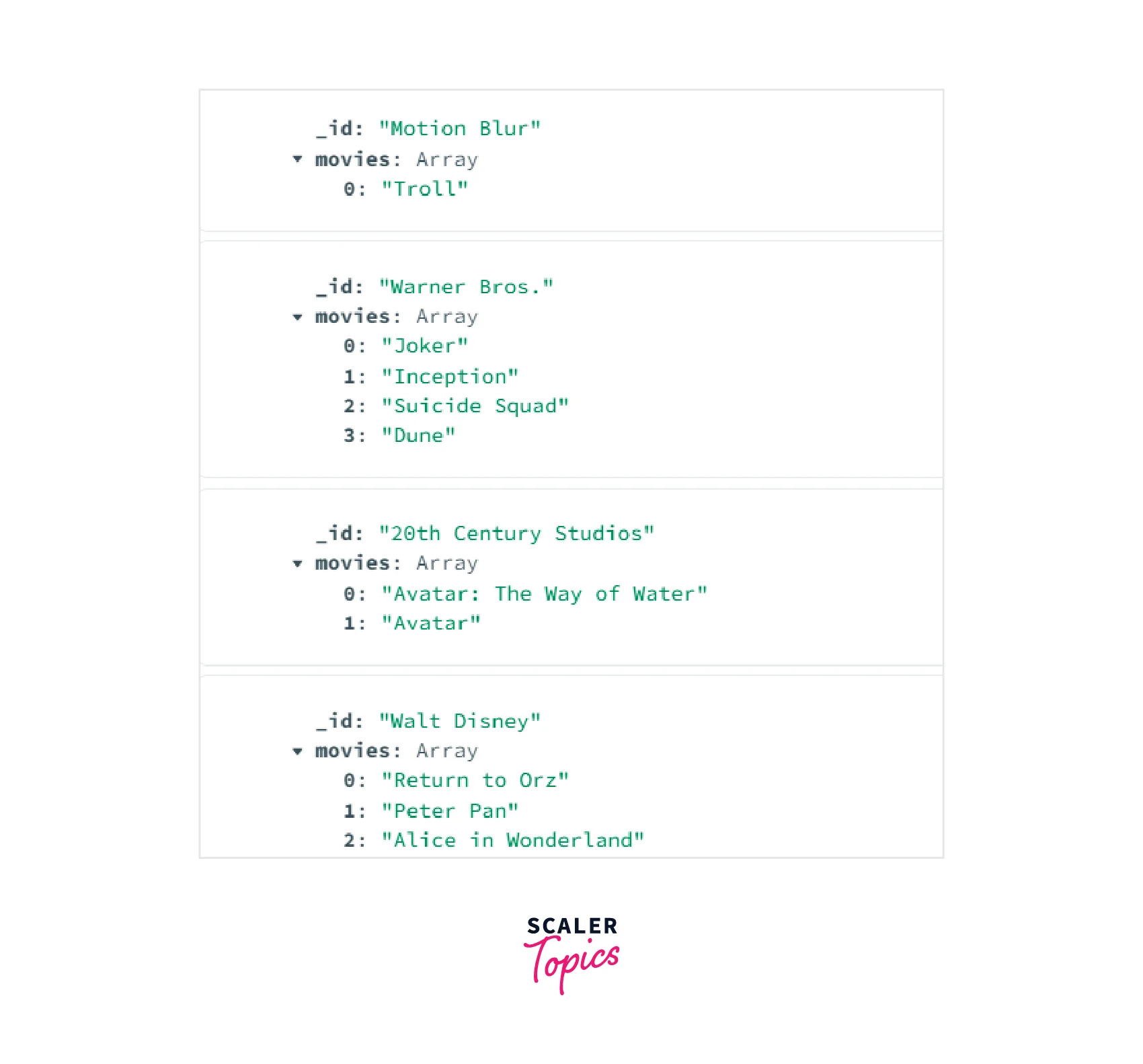 Thus in the image shown above, we can see that the collection has four documents. The documents have been grouped according to their "productionCompany". Each document's "_id" field represents their "productionCompany" and the "movies" field is an array of the movie "titles" which belong to the same "productionCompany".