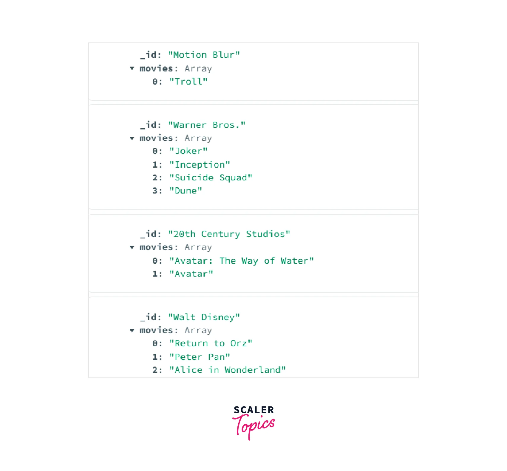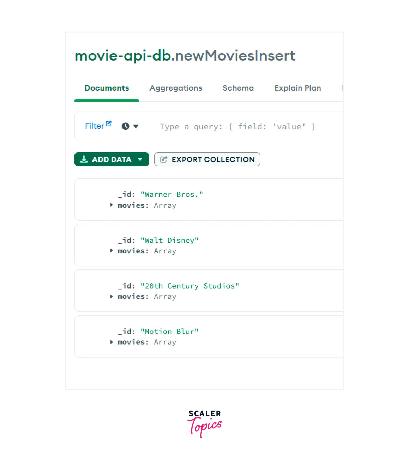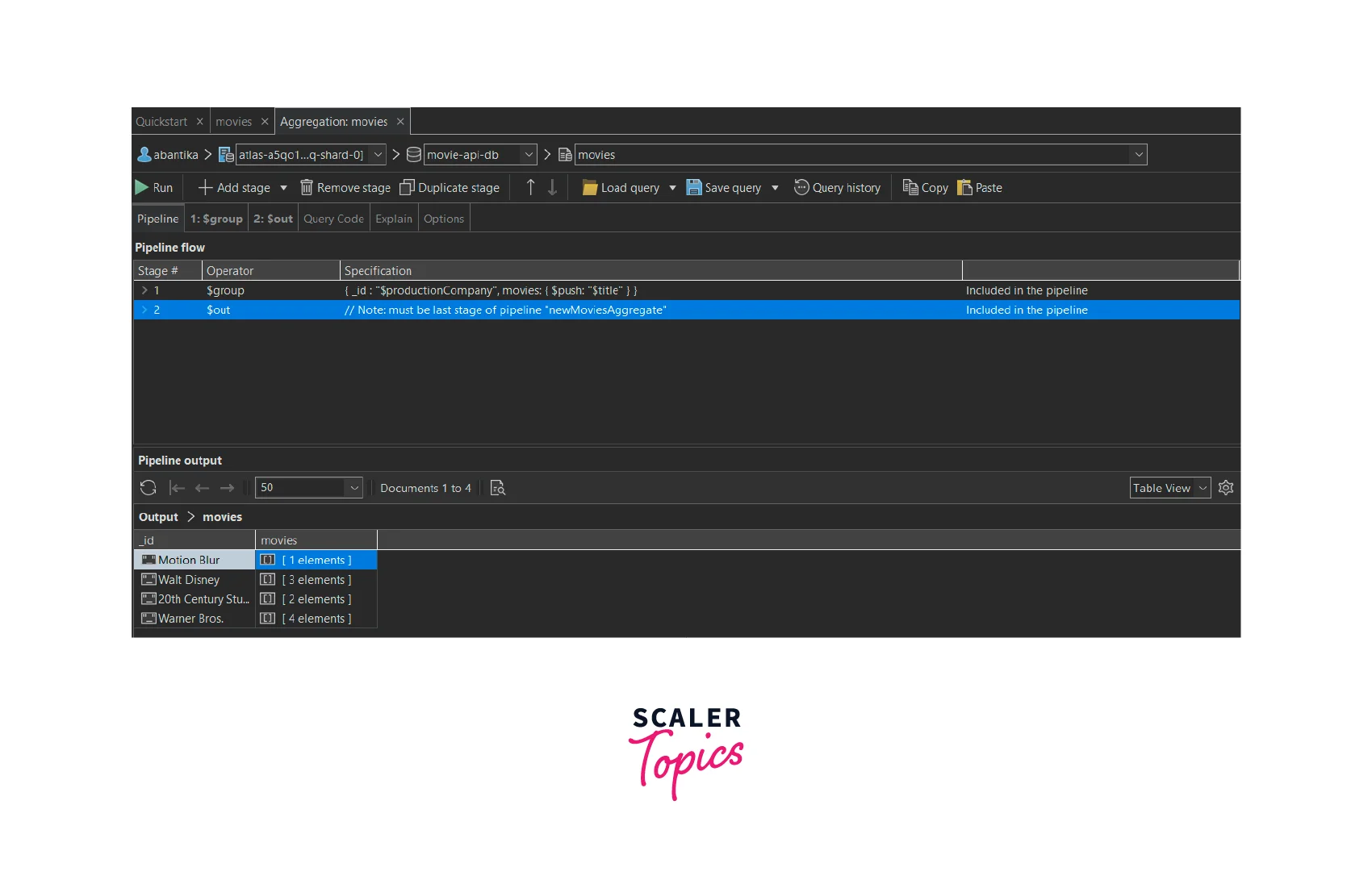 In the image given above, we can see that the "newMoviesInsert" collection has four documents. The documents have been grouped according to their "productionCompany". Each document's "_id" field represents their "productionCompany" and the "movies" field is an array of the movie "titles" which belong to the same "productionCompany".