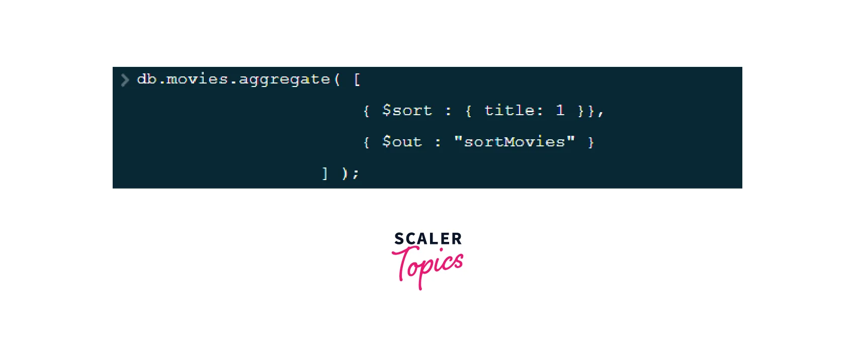 The following aggregation operation sorts the data alphabetically in the "movies" collection according to the "title" of the movies and then writes the results to the "sortMovies" collection in the "movie-api-db" database.