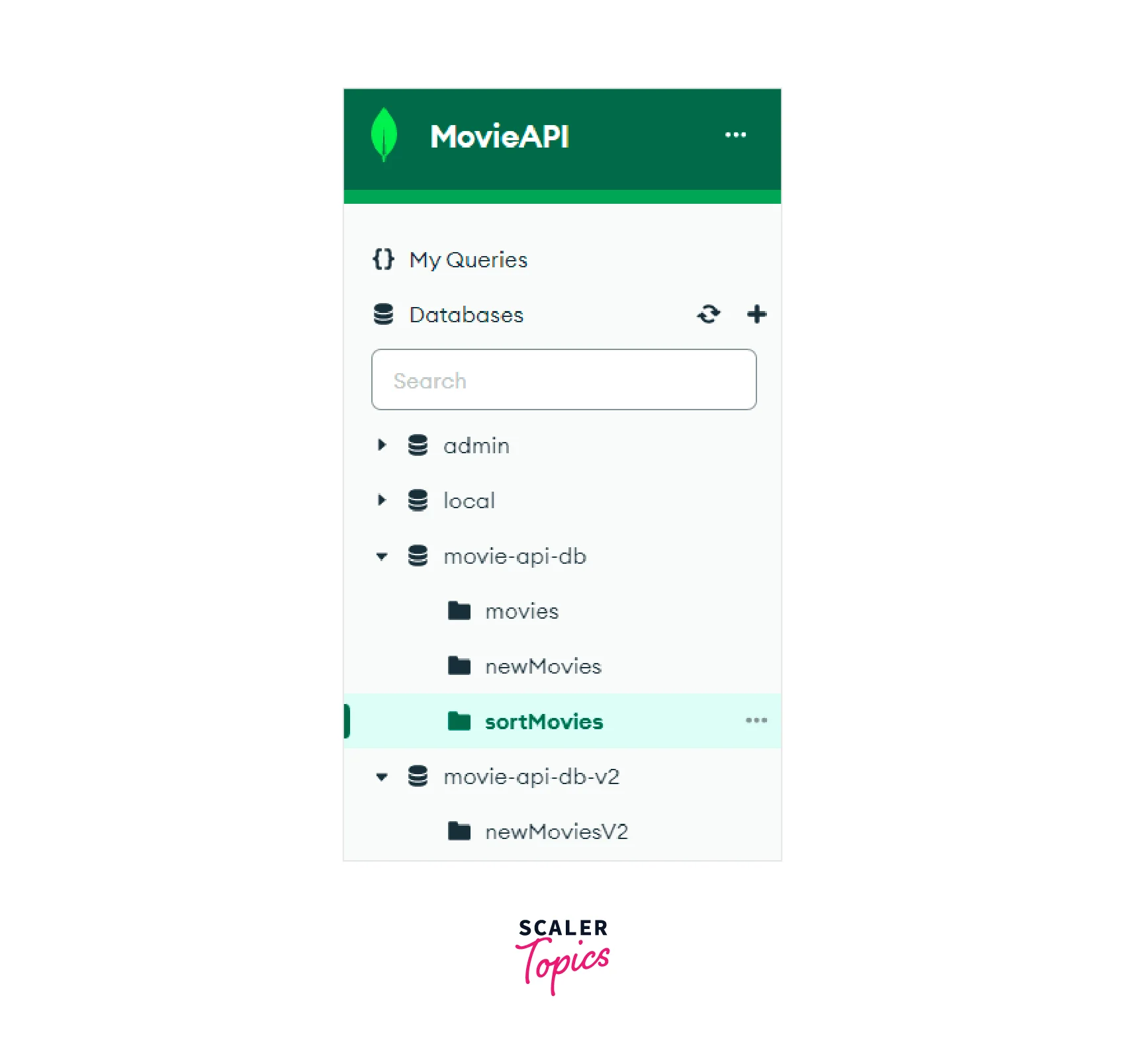 We can see that after running the command in the Mongo Shell, a new collection named "sortMovies" in the "movie-api-db" database has been created.