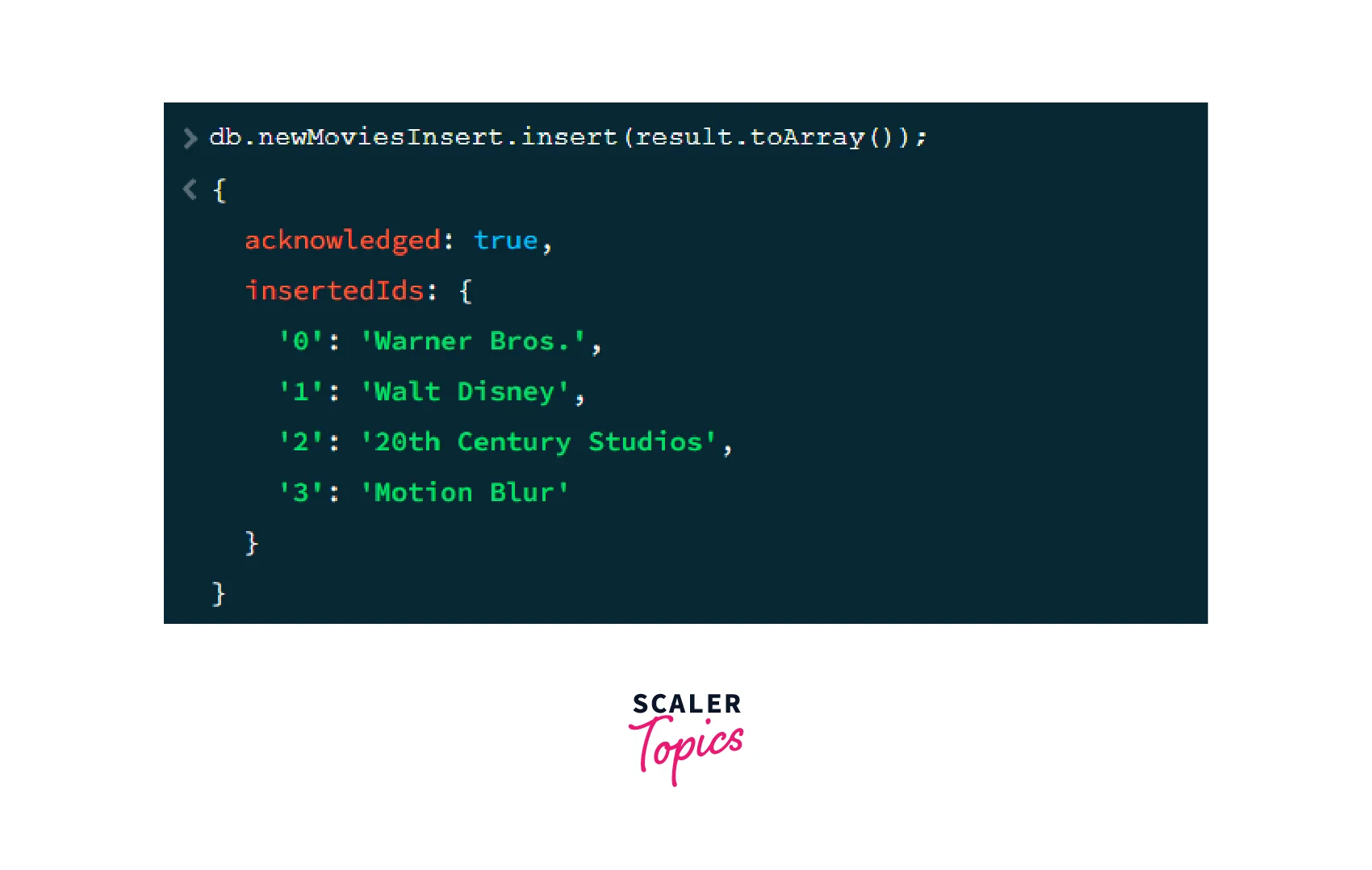 Now, we will convert the "result" variable into an array and insert it into a new collection named “newMoviesInsert”.