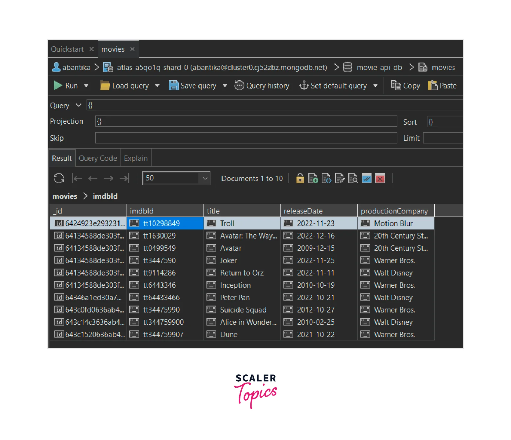 Thus in the image shown below, we can see that the "sortMovies" collection has been created in the "movie-api-db" database. The collection has all ten documents. The documents have been sorted alphabetically according to their "title" fields.