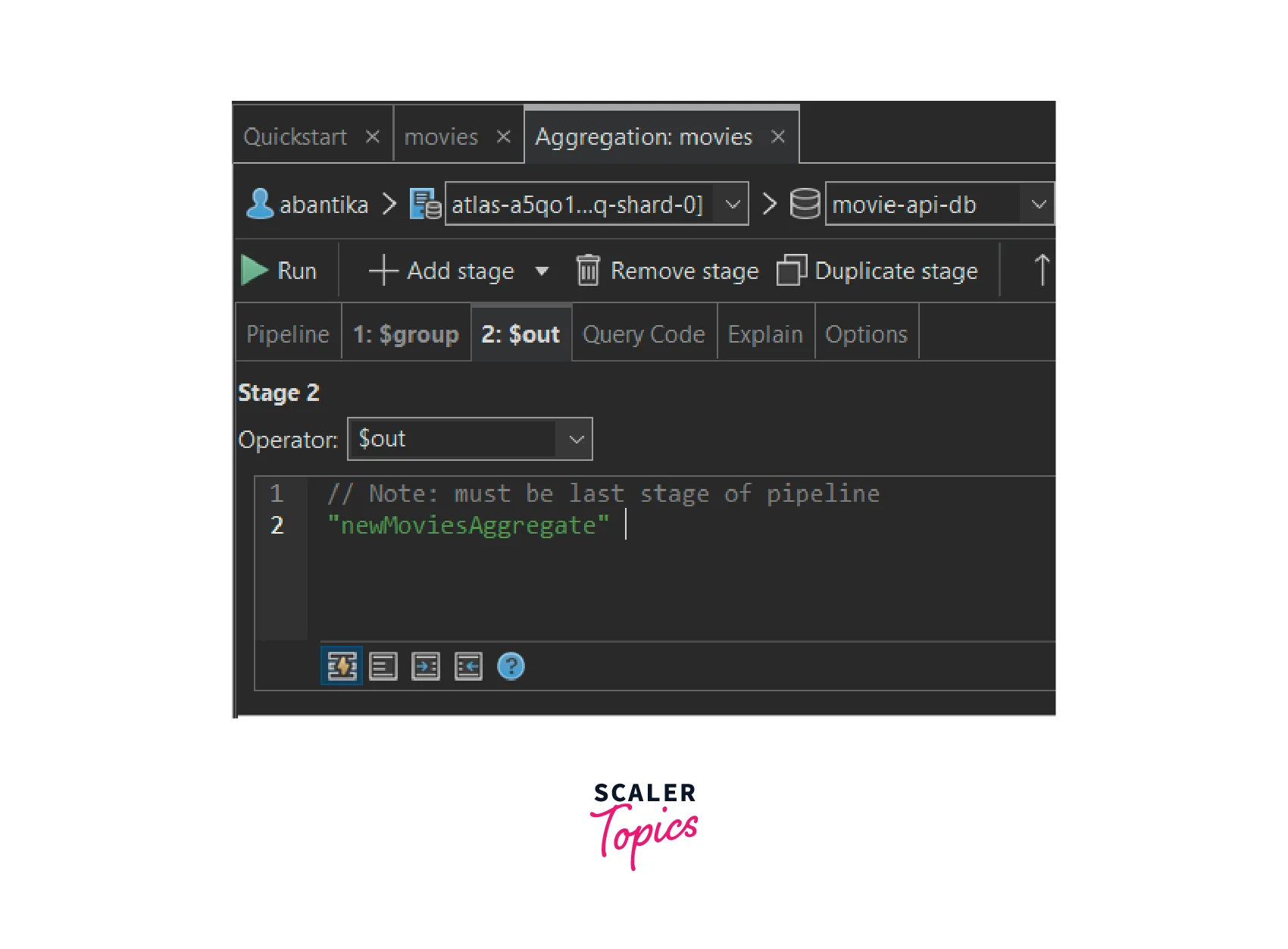 NOTE: If you want to save the aggregate data in a new collection in a separate database, for e.g., we want to save the aggregate data in a collection named "newMoviesAggregate" in a database named "movie-api-db-v2" database, the syntax for the out stage should be: