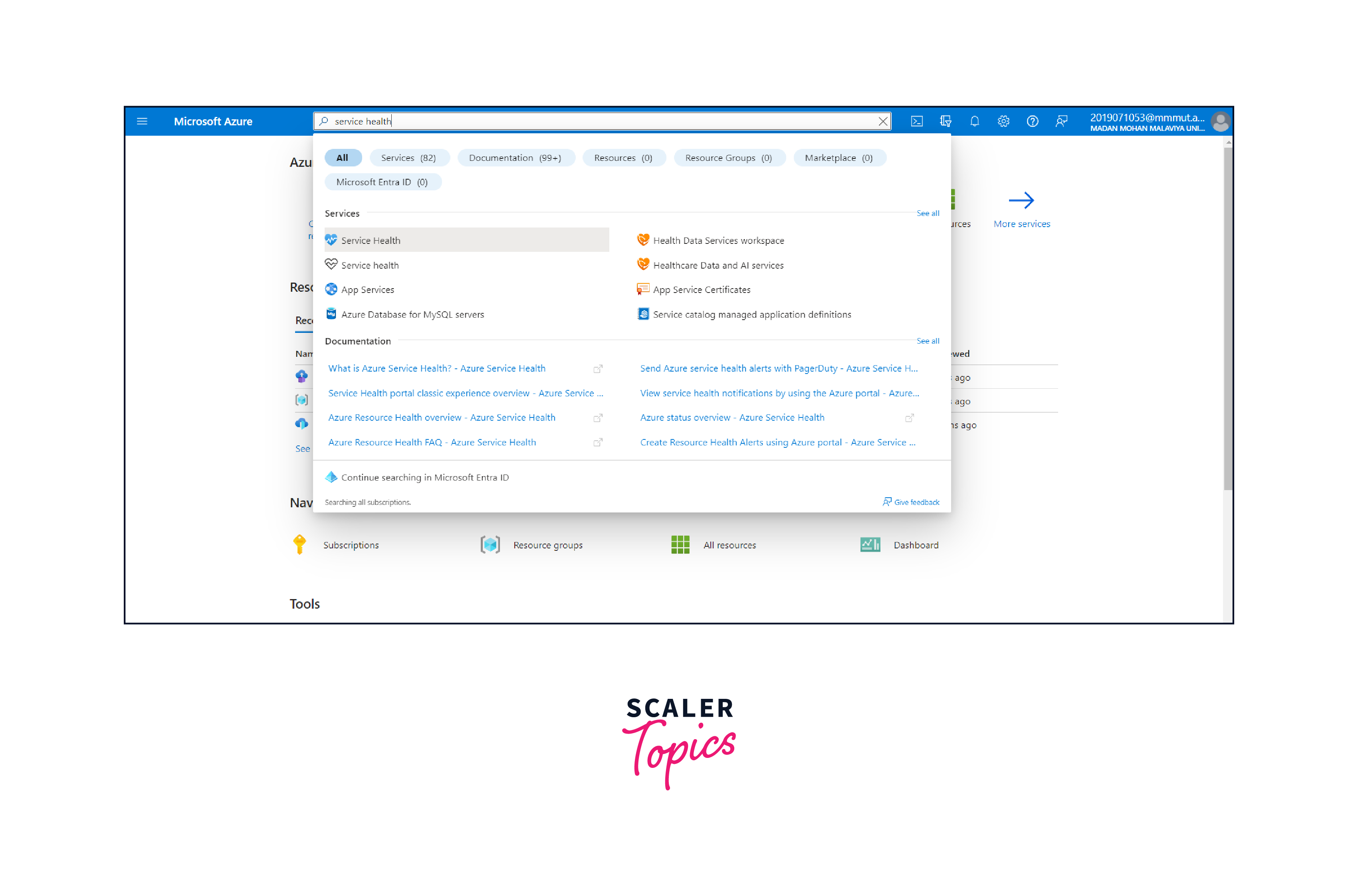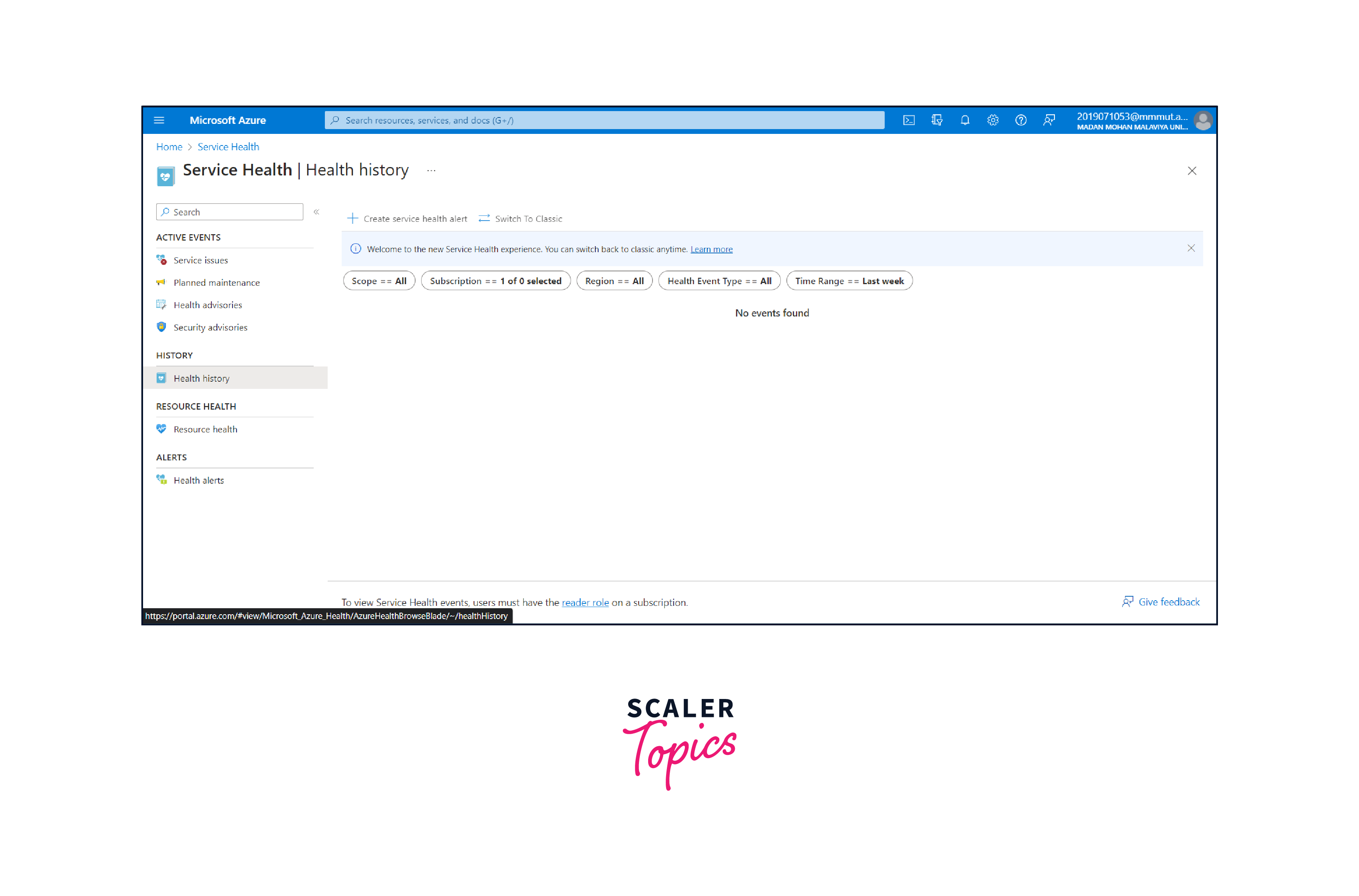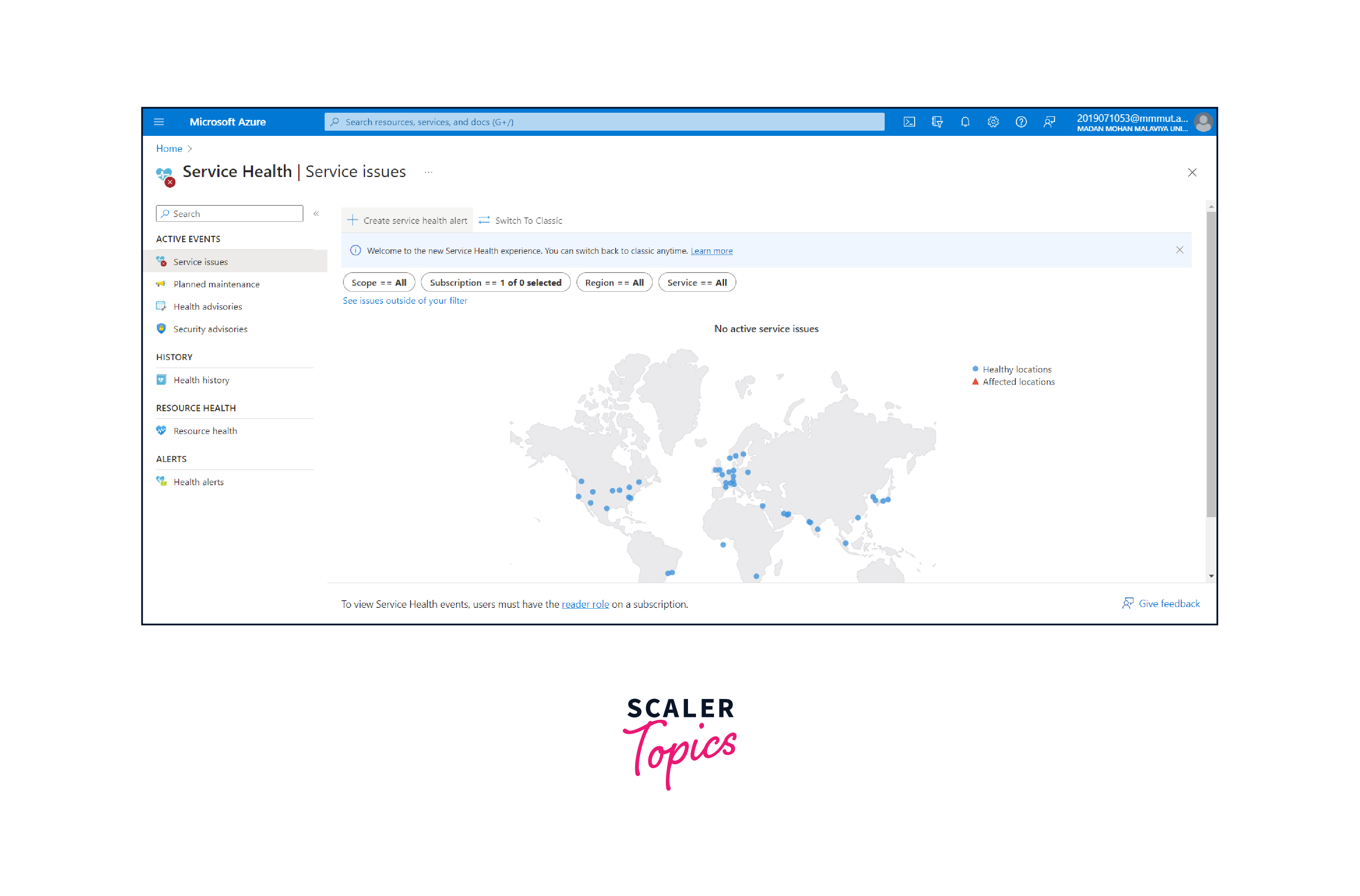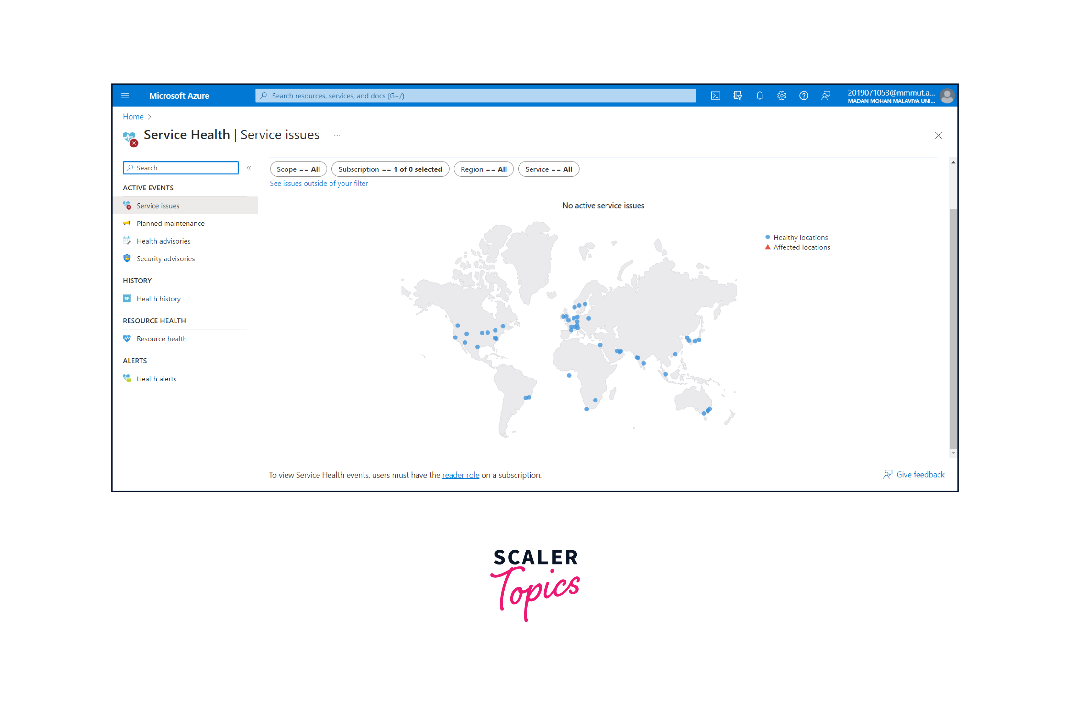 - Azure Portal's Service Health feature presents a comprehensive dashboard of your Azure services. This dashboard includes alerts regarding ongoing incidents, upcoming maintenance schedules, and health advisories.