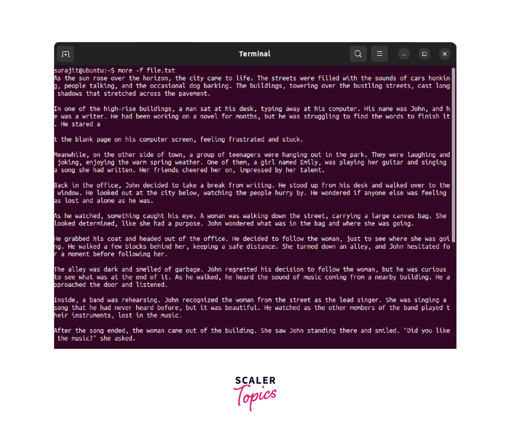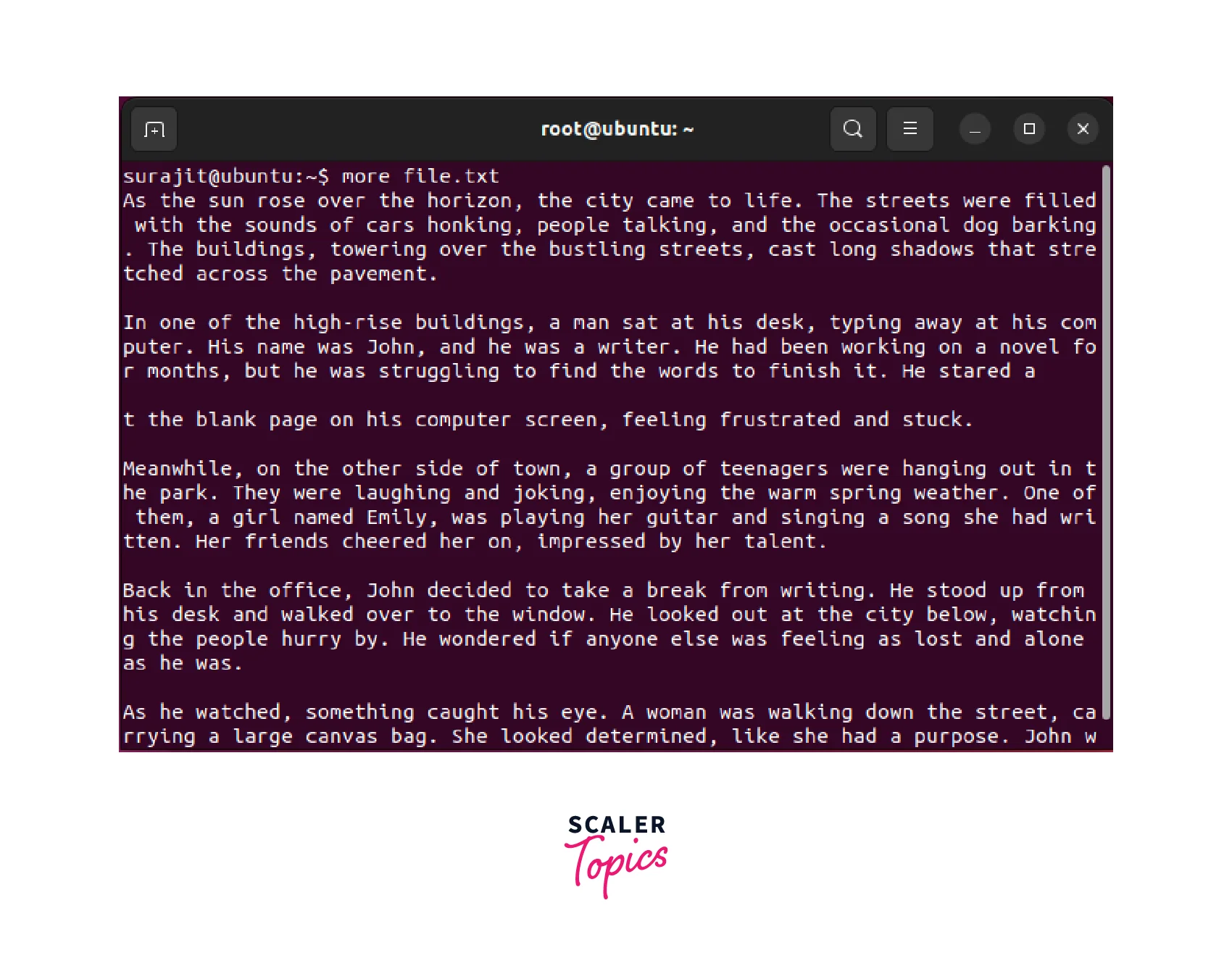By default, more commands in Linux will display the file one page at a time. You can navigate through the file using various commands: