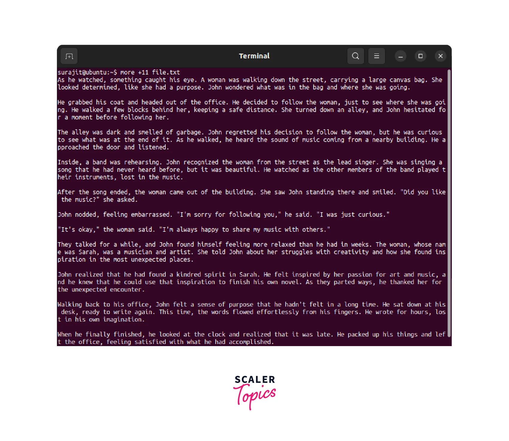 - To use the more command in Linux command, open a terminal window and type more command in Linux followed by the name of the file you want to view.