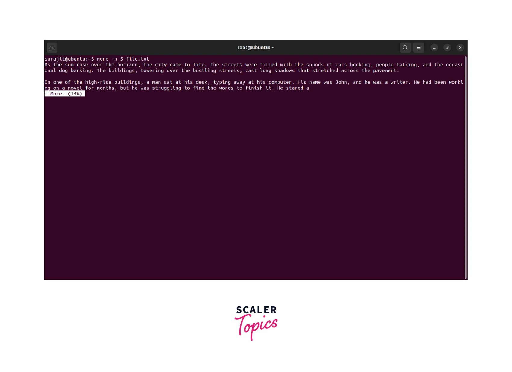 In this example, more command is used to view the contents of the myfile.txt file with five lines per page. You can change the number "5" to any number of lines that you prefer.