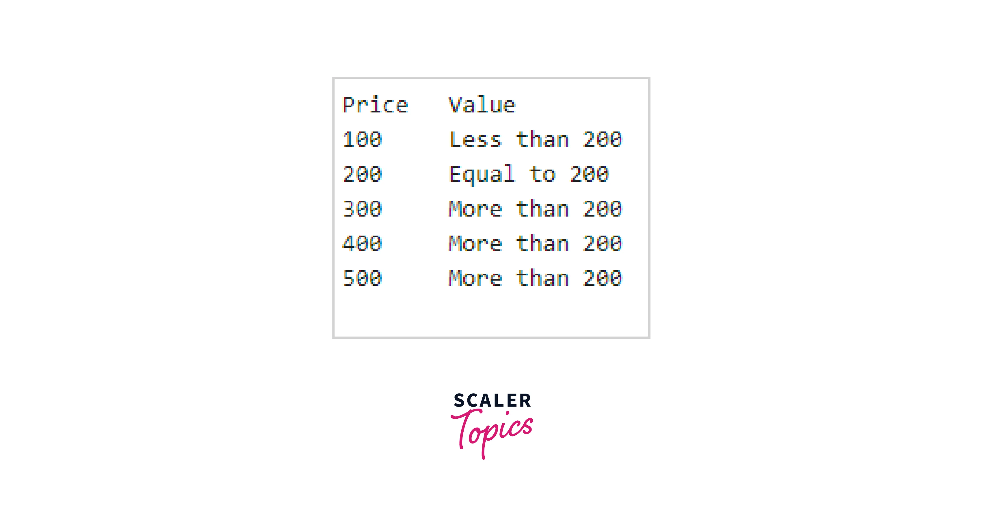 - The third part queries the data in the MyTable table and uses the MySQL CASE() function to apply conditions to the "price" column. The function checks the value of each row and assigns a corresponding text value based on the condition met. For example, when the value is less than 200, the text "Less than 200" is returned; when the value is equal to 200, the text "Equal to 200" is returned, and when the value is greater than 200, the text "More than 200" is returned.