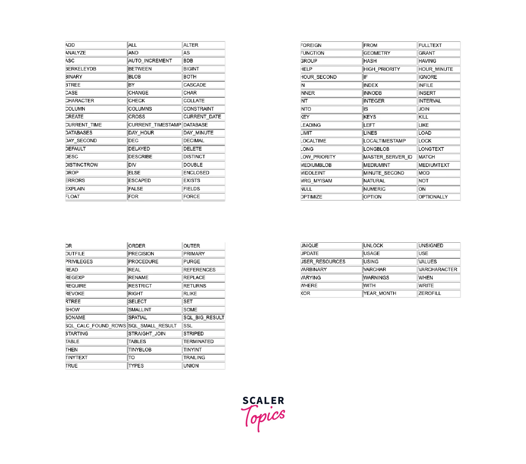 Certain words are disallowed by ANSI SQL as column or table names because they are reserved words or keywords. MySQL allows some keywords to be used as unquoted identifiers. Let's see these keywords in detail: