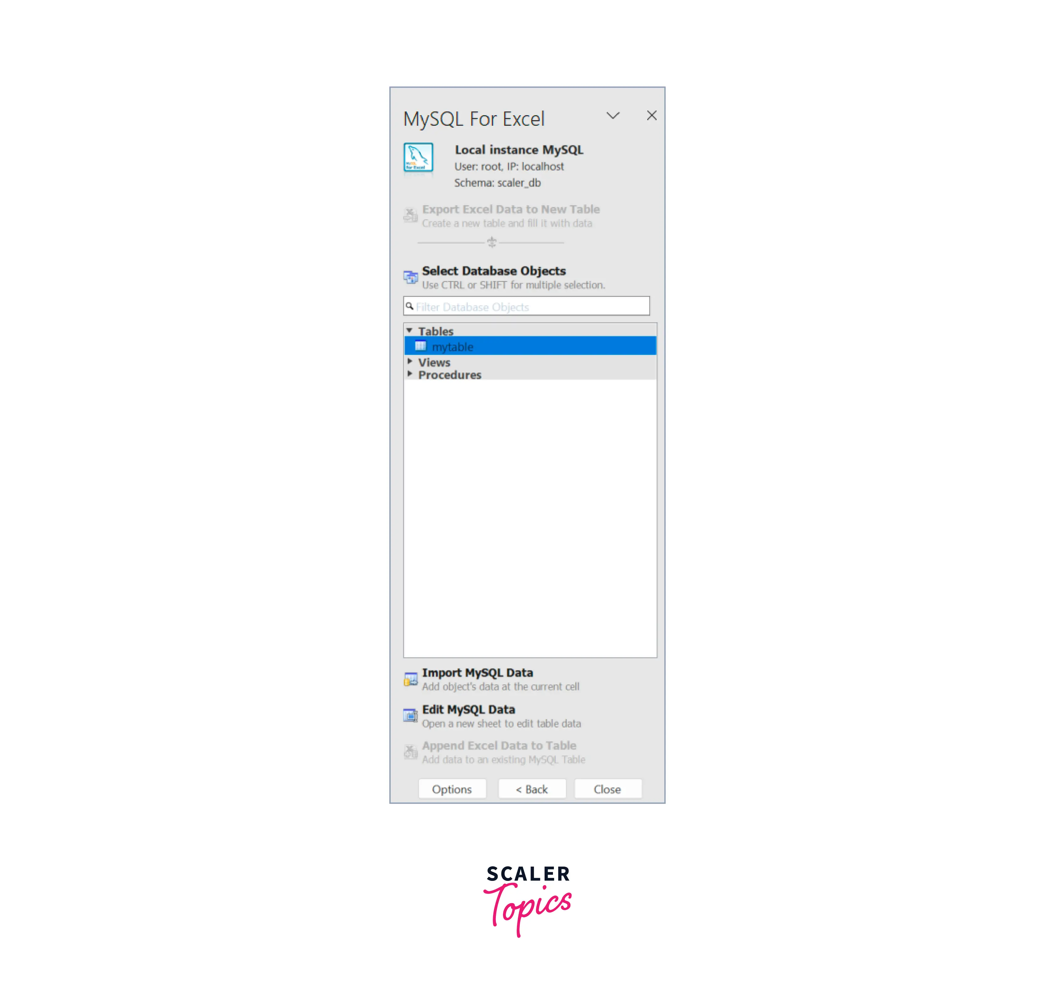 - Now MySQL for Excel panel will list all tables, views, and procedures from that database. Click on the table you want to import and Click on Import MySQL Data.